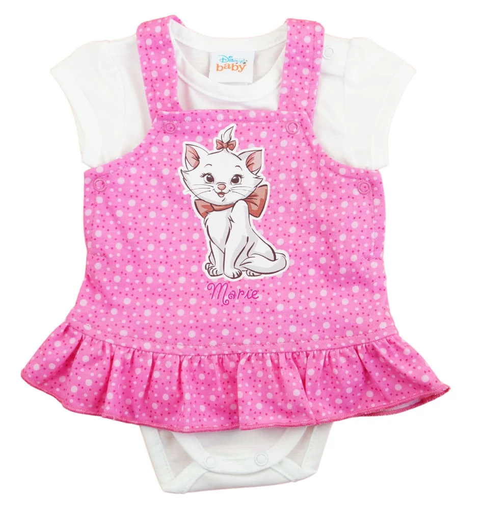 2 részes baba nyári szettt kantáros szoknyával, Marie cica mintával Eredeti Disney termék A kis hercegnők igazi rajongói lesznek ennek a 2 részes Disney Marie cica szetthez, amely csábítóan mosolyog a szoknya elején. A nyári szett eredeti Disney termék, és magában foglal egy kantáros, patentos fodros aljú szoknyát, amelynek anyaga 100% pamut. A szoknya elején Marie cica nyomás látható, amely minden kislány szívet megdobogtat. A szettet kiegészíti egy fehér rövid ujjú pamut body, amely 100% pamutból készült, hogy a legkényelmesebb viselet legyen a nyári napokon. Büszkék vagyunk rá, hogy ez a minőségi magyar termék a Disney hivatalos licencével rendelkezik. Minőségi magyar termék Anyaga: 100% pamut Minőség: I. osztály
