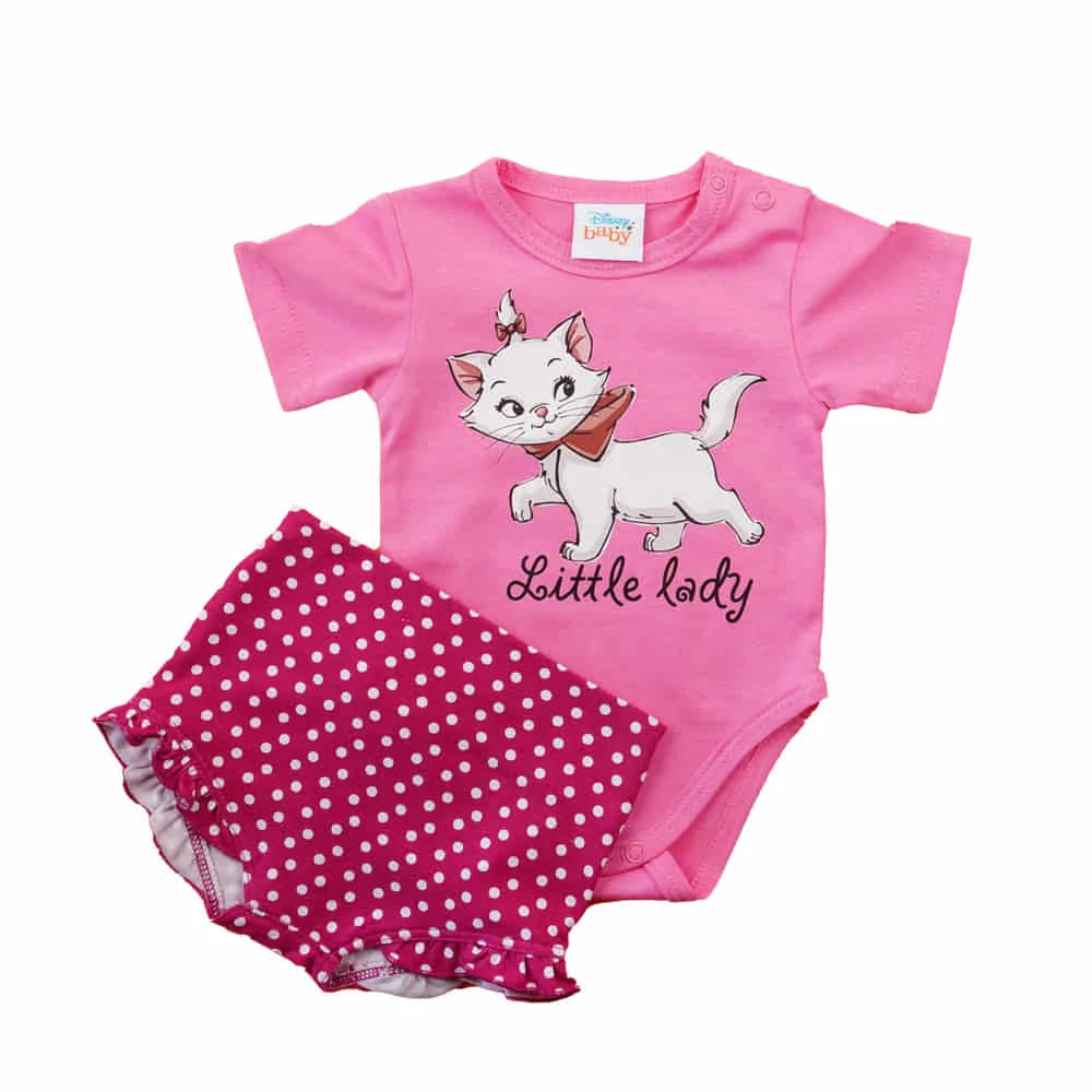 2 részes baba szett Egy szett, ami minden kis hercegnő gardróbjából elengedhetetlen! Ez az eredeti Disney 2 részes baba szett a bájos Marie cicával nemcsak kényelmes, de ellenállhatatlanul cuki is. A szett egy rövid ujjú, vállon patentos baba bodyból és egy hozzáillő, gumis derekú baba nadrágból áll – mindkettő úgy lett megalkotva, hogy a legkisebbek számára is maximális kényelmet nyújtson. A body-t a kedves Marie cica minta díszíti, amitől még különlegesebb és szerethetőbb lesz ez a hétköznapi darab. A nadrág puha, rugalmas anyagból készült, így követi a babák mozgását és tökéletes komfortot biztosít egész nap. A body 100% pamutból, míg a nadrág 90% pamut és 10% elasztán keverékéből készült, így biztosítva az ideális egyensúlyt a kényelem és a tartósság között. A nikkelmentes patentoknak köszönhetően érzékeny bőrű babák is bátran viselhetik, mindenféle irritáció nélkül. Ez a szett nemcsak praktikus, hanem divatos is – garantáltan minden szem a kis viselőjére szegeződik majd! Tökéletes választás ajándéknak vagy a baba első stílusos szettjének. Minőségi magyar termék Anyaga: 100% pamut, 90% pamut – 10% elasztán Minőség: I. osztály