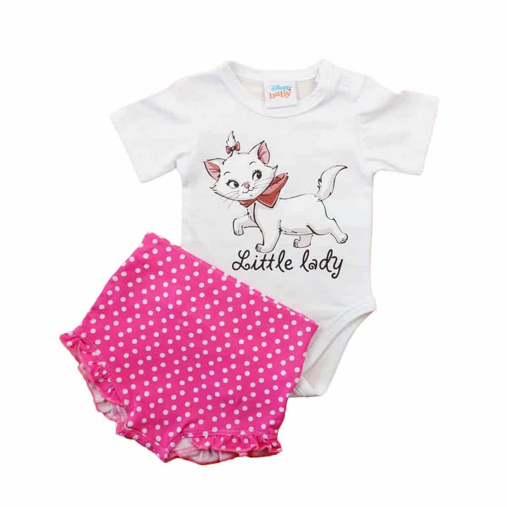 2 részes baba szett Egy szett, ami minden kis hercegnő gardróbjából elengedhetetlen! Ez az eredeti Disney 2 részes baba szett a bájos Marie cicával nemcsak kényelmes, de ellenállhatatlanul cuki is. A szett egy rövid ujjú, vállon patentos baba bodyból és egy hozzáillő, gumis derekú baba nadrágból áll – mindkettő úgy lett megalkotva, hogy a legkisebbek számára is maximális kényelmet nyújtson. A body-t a kedves Marie cica minta díszíti, amitől még különlegesebb és szerethetőbb lesz ez a hétköznapi darab. A nadrág puha, rugalmas anyagból készült, így követi a babák mozgását és tökéletes komfortot biztosít egész nap. A body 100% pamutból, míg a nadrág 90% pamut és 10% elasztán keverékéből készült, így biztosítva az ideális egyensúlyt a kényelem és a tartósság között. A nikkelmentes patentoknak köszönhetően érzékeny bőrű babák is bátran viselhetik, mindenféle irritáció nélkül. Ez a szett nemcsak praktikus, hanem divatos is – garantáltan minden szem a kis viselőjére szegeződik majd! Tökéletes választás ajándéknak vagy a baba első stílusos szettjének. Minőségi magyar termék Anyaga: 100% pamut, 90% pamut – 10% elasztán Minőség: I. osztály