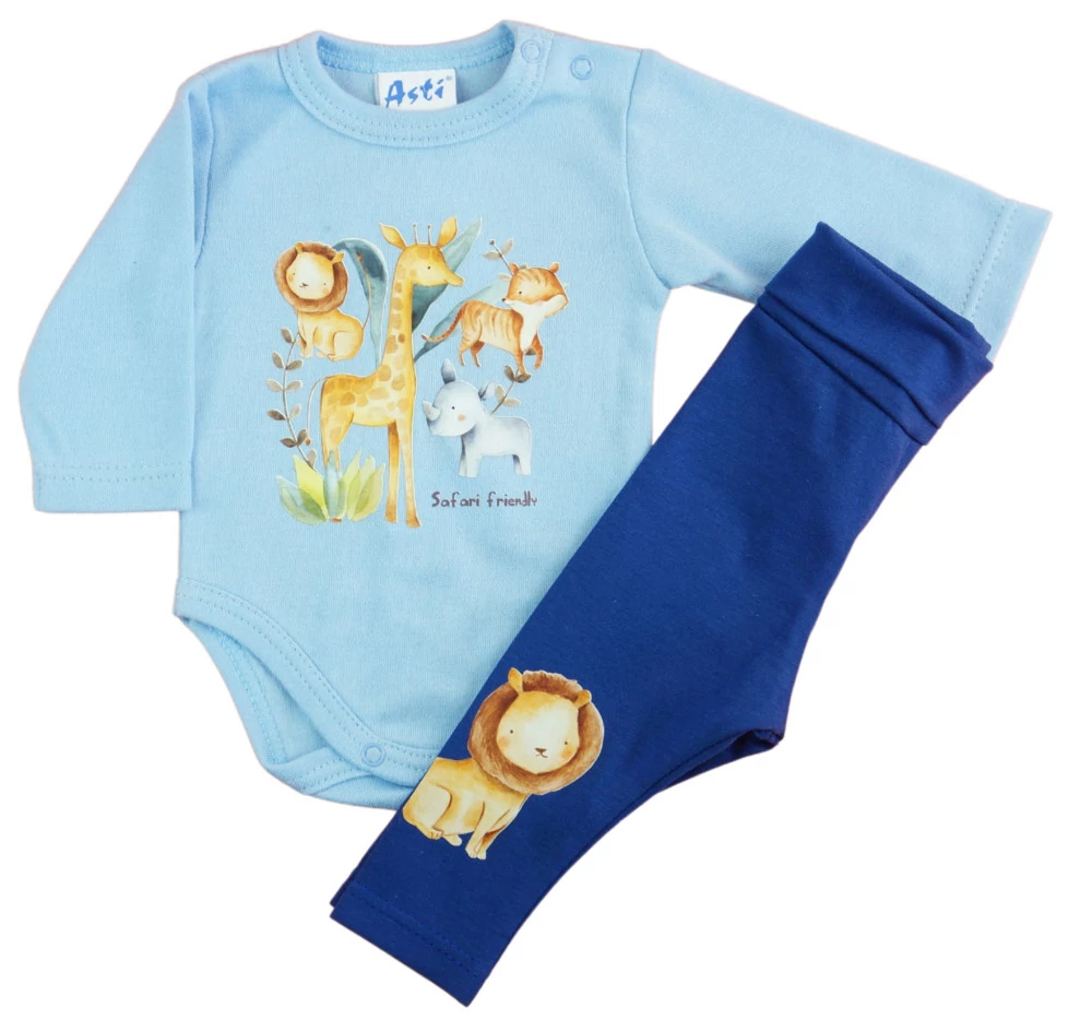 2 részes kisfiú szett szafaris mintával A kisfiúk divatjának legújabb trendjét képviseli ez a 2 részes szett, amelynek minden darabja Magyarországról származik. Az összeállításban található hosszú ujjú body és kényelmes baba nadrág igazán vagány és kispasis hangulatot kölcsönöz viselőjének. Mindkét darab finom pamut anyagból készült, a nadrág rugalmas pamutja pedig szabad mozgást biztosít a babának. A szett kiváló minőségű, jól mosható, szín- és formatartó anyaga miatt nemcsak a babák, de az anyukák kedvence is lesz! A body 100% pamutból, a nadrág 90% pamutból és 10% elasztánból készült, ezáltal biztosítva a kiváló minőséget. A termék nikkelmentes patenttal készül, így az érzékeny babák sem fognak allergiás reakciót tapasztalni. Minőségi magyar termék Minőség: I. osztály