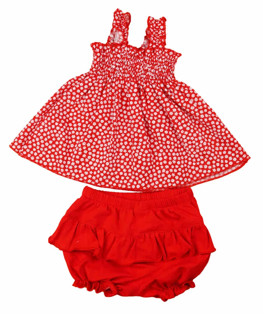 Egy igazi kislány álom öltözet ez a kétrészes nyári szett! A piros fodros rövidnadrág és a tunika szettje igazi forró nyári napokon is tökéletes választás, hiszen a kényelem mellett, a stílusos megjelenést sem hagyja figyelmen kívül. A rövidnadrág gumis derék- és szármegoldással biztosítja a kis mozgékony testek számára a szabad mozgást, miközben a pelust is tökéletesen helyén tartja. A hosszított tunika, mely vékony pamutvászonból készült, jól esik a bőrnek, még a legmelegebb nyári napokon is. A mellrészénél és a vállpántjánál alkalmazott gumírozás pedig segít a könnyű öltözködésben. Elbűvölően cuki, könnyen kezelhető, szín- és formatartó készlet, mely minden kislányt igazi nyári hercegnővé varázsol. Kiváló minőségű, 100% pamut anyagból készült, mely garantáltan bababarát és Magyarországon készült.