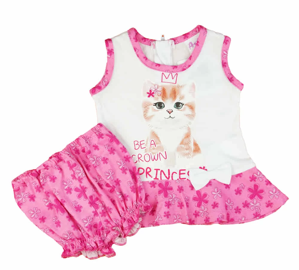 Ez a 2 részes kislány nyári szett igazi napsütötte napokra készült. A rövidnadrág fodros szabása és gumis derék- és szármegoldása tökéletes kényelmet és biztonságot nyújt a legmozgékonyabb játékokhoz is. A szett felső része egy hosszított, tunika fazonú darab, mely vékony, légáteresztő pamutból készült, hogy a hőségben is frissességet biztosítson kis hordozójának. Az alján található fodros szoknyarész és masni, valamint az elején látható cica minta teszi igazán cukivá ezt a szettet. Könnyű kezelhetőség, szín- és formatartó tulajdonságok jellemzik ezt a magas minőségű, 100% pamutból készült, bababarát terméket. Büszkék vagyunk rá, hogy ez a darab is magyar munkával készült és I. osztályú minőséget képvisel.