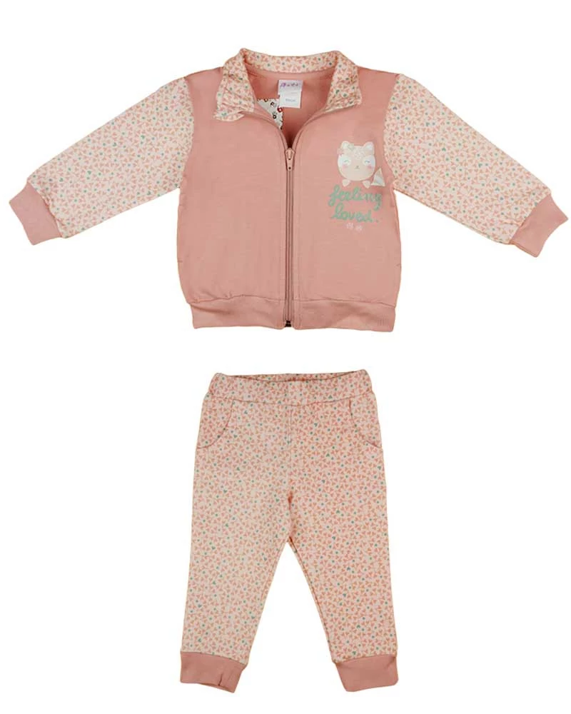 A cicás mintával ellátott, púderszínű szabadidő szett tökéletes választás kis hercegnődnek! A két részes szettben található elöl cipzáros pamut felső és az oldalt zsebes, gumis derekú pamut nadrág kombinációja biztosítja a mindennapi kényelmet és praktikumot. A kiváló minőségű, 90% pamutból és 10% elasztánból készült ruhadarabok garantálják a tartósságot és időtállóságot. Kényeztesd kislányodat ezzel a cicás mintával díszített szettben, amit a magyarországi Andrea Kft. készített, minőségi I. osztályú termékként. A cicák iránti rajongás és a csinos megjelenés soha nem megy ki a divatból!