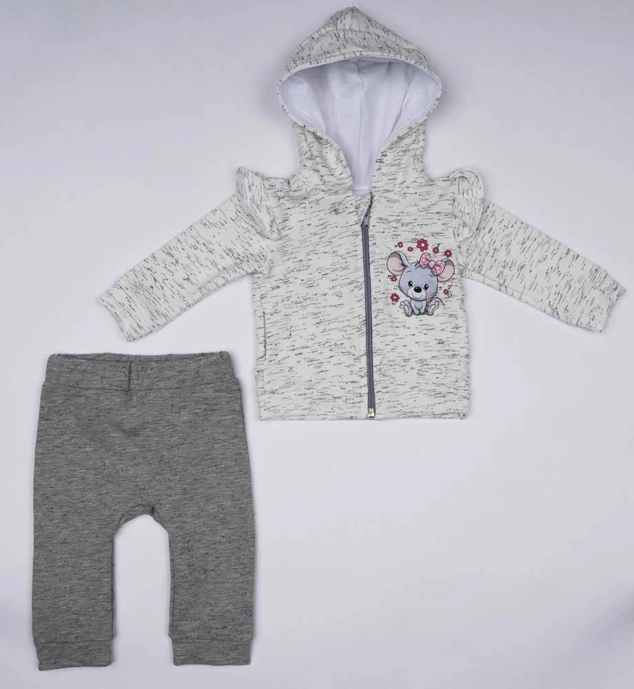 Kétrészes kislány szabadidő szett Egérke mintával Kényeztesse kislányát ezzel a két darabos, Egérke mintás szettel. A szett nyers színű, éppen olyan cuki, mint a rajta lévő karakter. A szett egy kapucnis cipzáras felsőből és egy elegáns nadrágból áll, amelyek finom részletekkel, minőségi kidolgozással és visszafogott nyomással készültek. A fodrok, a vékonyított passzé kidolgozás eleganciát kölcsönöznek az összeállításnak. Az anyaga vékony minőségi pamut poliészter, amely szín- és formatartó, valamint jól bírja a mosást. A szett csinos, mégis sportos, jól variálható, és garantáltan a kislányok kedvence lesz. Minőségi magyar termék Anyaga: 65% pamut, 35% poliészter Minőség: I. osztály