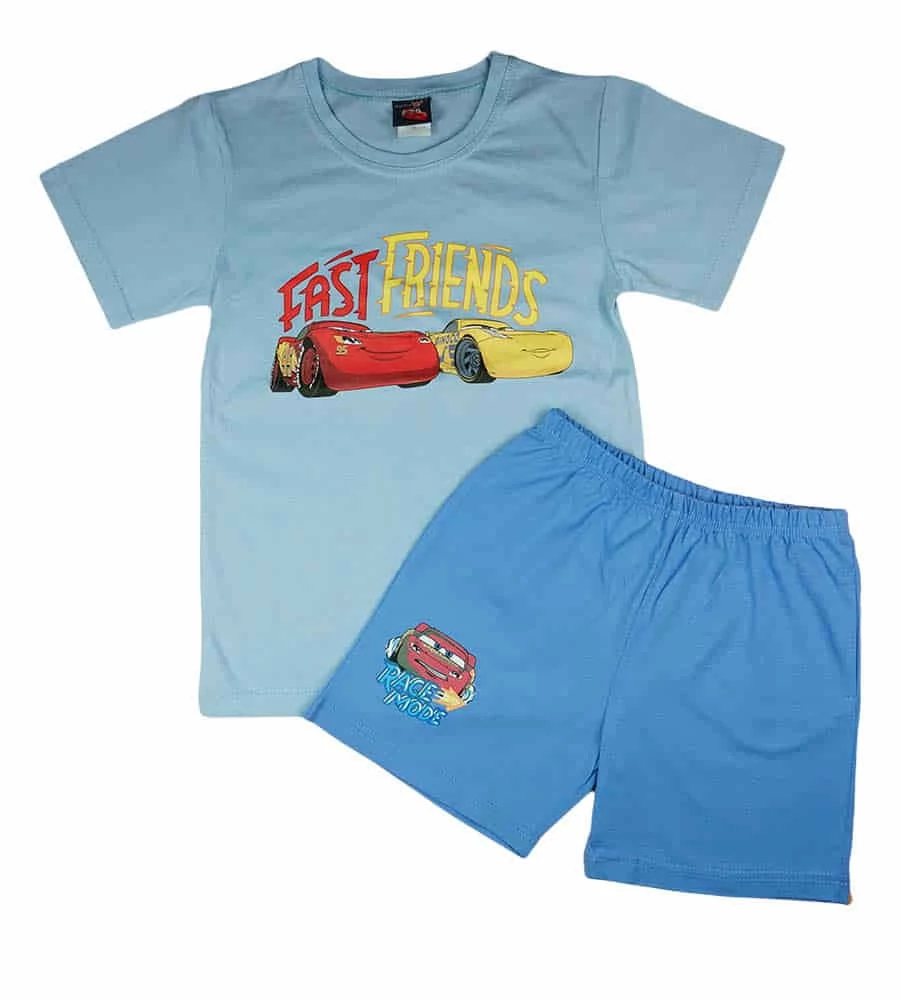 Készülj fel a nyári kalandokra ezzel a 2 részes Verdák mintás kisfiú szettel! A szettben található egy világoskék rövid ujjú póló, melyen a kedvenc Verdák karaktereid díszelegnek, valamint egy hozzáillő rövidnadrág, mely oldalzsebekkel és gumis derekú kivitelben készült a kényelem érdekében. Mindkét darab vékony, 100% pamut anyagból készült, így garantáltan nem okoznak kellemetlenséget a meleg nyári napokon sem. Az Andrea Kft. minőségi magyar termékét nikkelmentes patenttal látták el, így az érzékeny bőrű babák sem szenvednek majd allergiás reakciót. Engedd, hogy gyermeked a Disney varázslatos világának részese legyen minden nap!