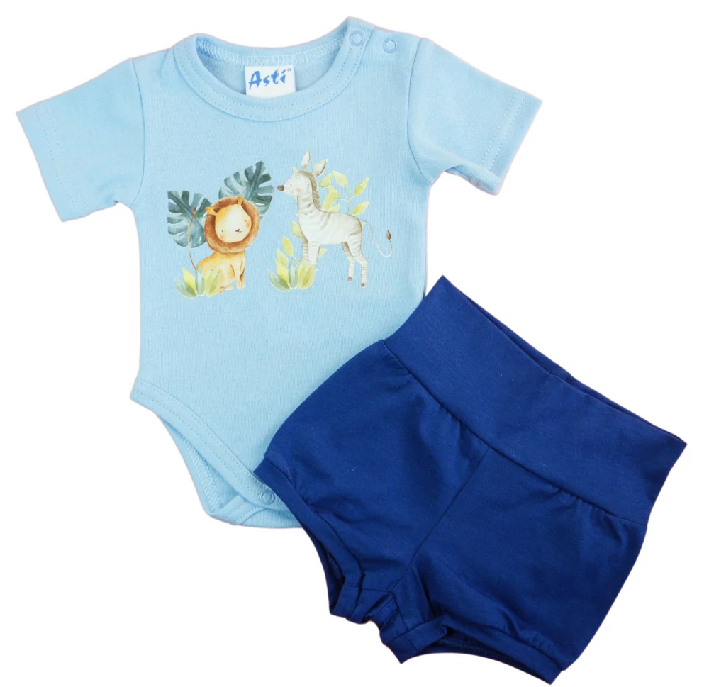 2 részes rövidnadrágos kisfiú szett szafaris mintával A kisfiúk divatjának legújabb trendjét képviseli ez a 2 részes szett, amelynek minden darabja Magyarországról származik. A szett egy magasderekú rövidnadrágot és egy egyszínű rövid ujjú bodyt tartalmaz, igazán vagány és kispasis hangulatot kölcsönöz viselőjének. Mindkét darab finom pamut anyagból készült, a nadrág rugalmas pamutja pedig szabad mozgást biztosít a babának. A szett kiváló minőségű, jól mosható, szín- és formatartó anyaga miatt nemcsak a babák, de az anyukák kedvence is lesz! A body 100% pamutból, a nadrág 90% pamutból és 10% elasztánból készült, ezáltal biztosítva a kiváló minőséget. A termék nikkelmentes patenttal készül, így az érzékeny babák sem fognak allergiás reakciót tapasztalni. Minőségi magyar termék Minőség: I. osztály