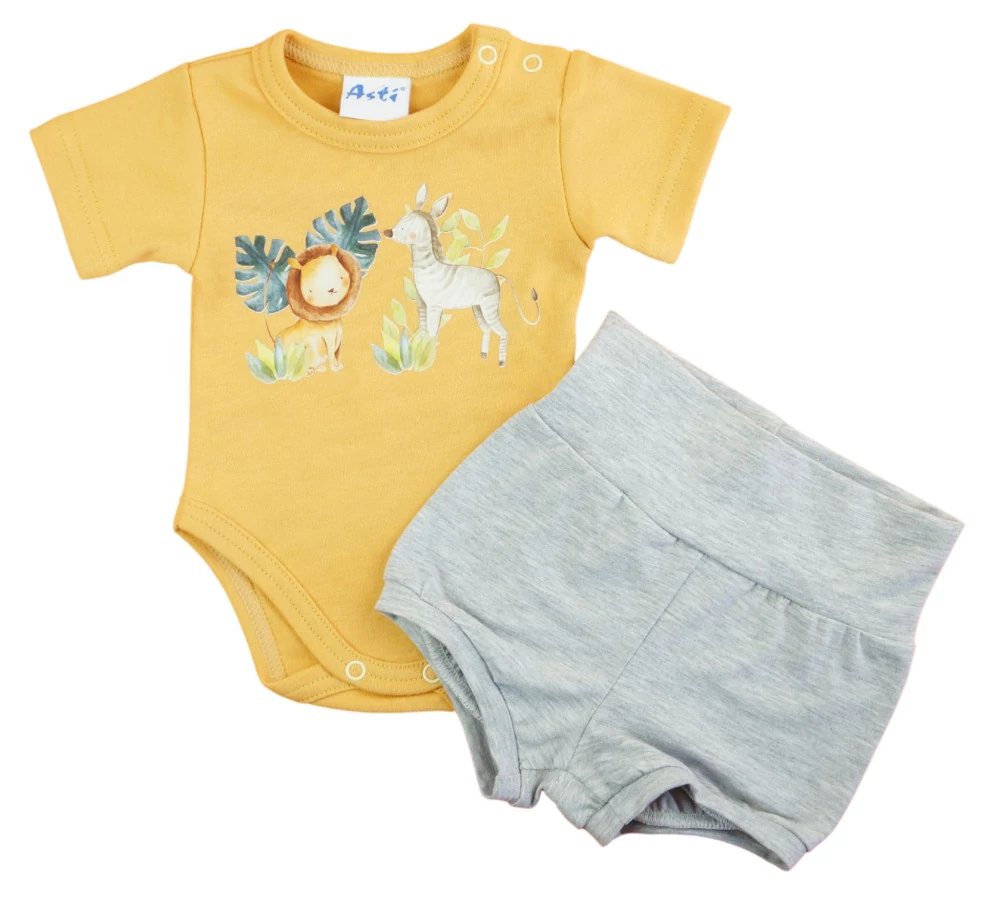 2 részes rövidnadrágos kisfiú szett szafaris mintával A kisfiúk divatjának legújabb trendjét képviseli ez a 2 részes szett, amelynek minden darabja Magyarországról származik. A szett egy magasderekú rövidnadrágot és egy egyszínű rövid ujjú bodyt tartalmaz, igazán vagány és kispasis hangulatot kölcsönöz viselőjének. Mindkét darab finom pamut anyagból készült, a nadrág rugalmas pamutja pedig szabad mozgást biztosít a babának. A szett kiváló minőségű, jól mosható, szín- és formatartó anyaga miatt nemcsak a babák, de az anyukák kedvence is lesz! A body 100% pamutból, a nadrág 90% pamutból és 10% elasztánból készült, ezáltal biztosítva a kiváló minőséget. A termék nikkelmentes patenttal készül, így az érzékeny babák sem fognak allergiás reakciót tapasztalni. Minőségi magyar termék Minőség: I. osztály