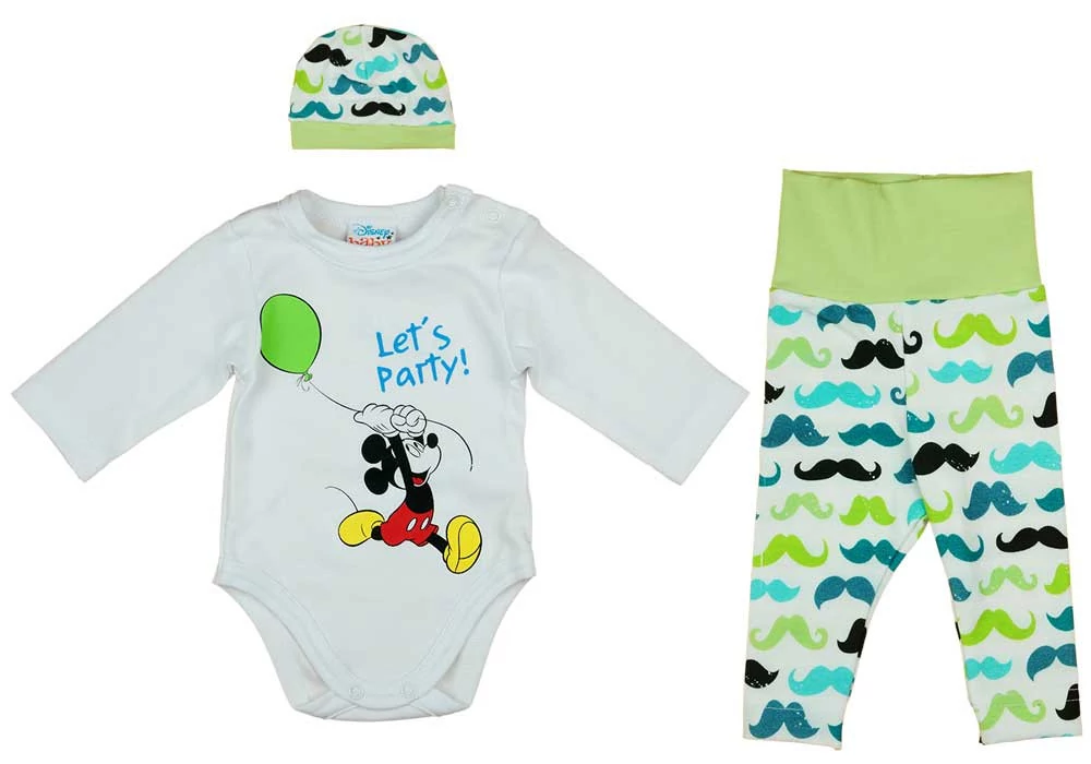 Mickey egér mindig is a legfontosabb Disney karakterek között volt, és most a kisfiúk is viselhetik őt erre a magas minőségű, 3 részes szettre nyomtatva. A szett egy hosszú ujjú bodyból, egy kényelmes nadrágból és egy aranyos sapkából áll, mindegyik Mickey egér mintával díszítve. A szett minden darabja ellenálló, bababarát pamutból készült, hogy a legkisebbek bőrének kényelemérzetét biztosítsa. A nadrág rugalmas pamut anyaga lehetővé teszi a baba szabad mozgását, míg a sapka elasztikus anyaga tökéletesen illeszkedik a baba fejéhez. Az ellenálló, könnyen mosható és szín- és formatartó anyag garantálja, hogy ez a szett az anyukák kedvence is lesz. A termék 100% magyar eredetű, ami a minőségét és tartósságát is garantálja. A nadrág és a sapka anyaga: 90% pamut, 10% elasztán. Ez a szett az I. osztály minőségi besorolást kapta, ami azt jelenti, hogy a legjobb minőségű anyagokból készült.