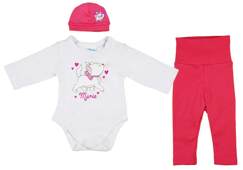 Kényeztesse kisbabáját ezzel a 3 részes, Marie cica mintás babaszettel, mely egyedülállóan kényelmes és stílusos viseletet biztosít. Az eredeti Disney termék megjelenése minden baba számára vidám és játékos atmoszférát teremt. A szettben található vállon patentos hosszú ujjú baba body, sapka és nadrág, mind a nagyon népszerű Marie cica mintával vannak díszítve. A szett anyaga puha és bőrbarát, 100% pamut, míg a nadrág és a sapka 90% pamutból és 10% elasztánból készült, ami rugalmasságot és extra kényelmet biztosít. Mindegyik termék a legmagasabb első osztályú minőséget képviseli, és büszkén gyártják Magyarországon. Különösen figyelnek a baba érzékeny bőrére, ezért a termék nikkelmentes patenttal készül, így nem vált ki allergiás reakciót az erre érzékeny babáknál. Válassza ezt a minőségi magyar terméket, a babája megérdemli!