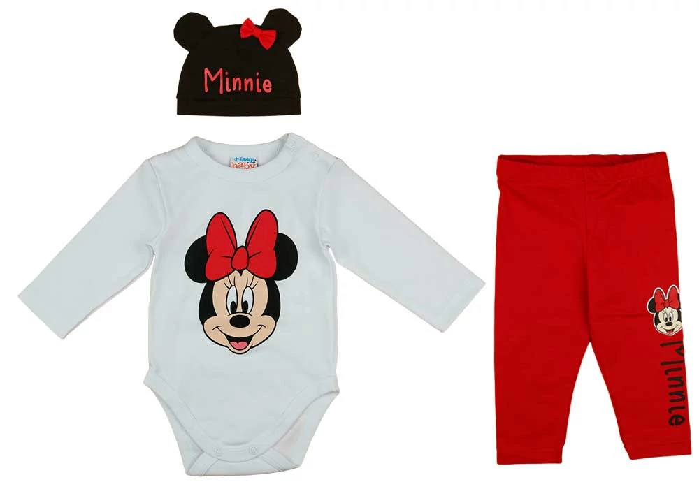 Adj hozzá egy csipetnyi varázslatot a babád ruhatárához ezzel a háromrészes Minnie Egér mintás baba szettel! Az eredeti Disney termék, melynek minden darabján vidáman mosolyog a világ legcukibb egere, Minnie. A szett hosszú ujjú, vállon patentos bodyból, gumis derekú nadrágból és sapkából áll, mind pedig Minnie Egér mintával díszítve. A minőségi magyar termék 100% pamutból készült, míg a nadrág és a sapka anyaga 90% pamut és 10% elasztán, biztosítva a tökéletes illeszkedést és kényelmet. Kiváló minőségű, nikkelmentes patentokkal van ellátva, hogy a babák bőre védve legyen minden allergiás reakciótól. A terméket a Magyarországon található Andrea Kft. gyártotta. Tegyél szert erre a szettre, hogy a kicsi öltözéke is olyan varázslatos legyen, mint Minnie Egér világa!