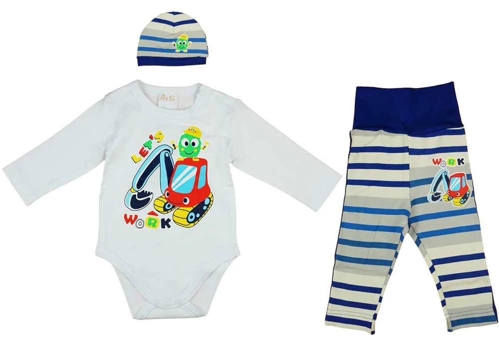Fedezd fel ezt a 3 részes baba szettet, amely munkagépes mintával készült! A szett hosszú ujjú baba bodyból, baba sapkából és baba nadrágból áll, mindegyik darabon vidám munkagépes minta található, amely garantáltan elvarázsolja kisfiadat. A vállon patentos body könnyen fel- és leölthető, így a pelenkázás gyors és egyszerű lesz. A baba sapka munkás manós mintával készült, ami szuper cuki és mókás. A nadrág kényelmes és rugalmas, így tökéletes lesz az aktív és mozgékony kisfiúknak. A szett minőségi magyar termék, 100% pamutból készült, míg a sapka és a nadrág 90% pamut és 10% elasztán keverékéből. Ez a kombináció biztosítja a puhaságot és a rugalmasságot, így a babád egész nap kényelmesen érezheti magát a ruhákban. A termék I. osztályú, nikkelmentes patenttal készült, ezért nem vált ki allergiás reakciót az erre érzékeny babáknál. Tökéletes választás a minőségi és stílusos baba ruházatot kereső szülőknek!