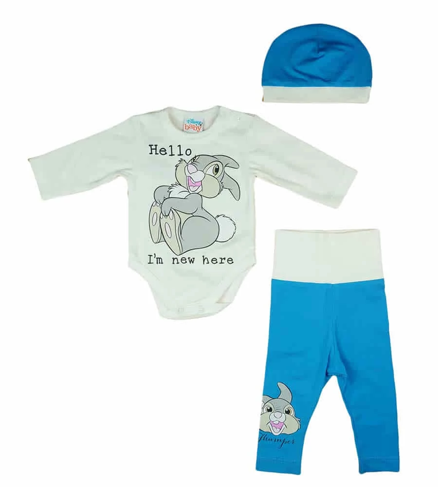 Édes kisbabádnak stílust és kényelmet biztosít ez a 3 részes baba szett, melyet a bájos Thumper nyuszi minta díszít. A világoskék színű hosszú ujjú body vállon elhelyezett patentos kialakítása könnyű öltöztetést biztosít. A belül bolyhos, Thumper nyuszi mintával ellátott baba nadrág pedig az édes álmokat garantálja. A szettet egy szintén belül bolyhos, puha baba sapka teszi teljessé, mely melegen tartja a kicsi fejét. Minden darabja 100% pamutból készült, kivéve a nadrág és a sapka, melyek 90% pamut és 10% elasztán keverékéből születtek. Minőségi magyar termék, melyet az Andrea Kft. gyártott, Magyarországon. A termékben használt patent nikkelmentes, így az erre érzékeny babák bőre sem irritálódik. Ezzel a szettel édes kisbabád igazi Disney herceg vagy hercegnő lehet!