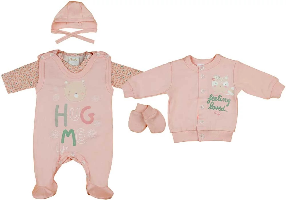 Indítsd varázslatosan kislányod napját ezzel a 5 részes, cicás mintával díszített babaszettünkkel, melynek barackszínű árnyalatai igazán vidámmá varázsolja a kis öltözetet. A készletben található ujjatlan, vállon patentos rugdalózó és elöl patentos kocsikabát mind a cicás mintákban pompázik, adva hozzá egy kis játékosságot a mindennapi viselethez. A mintás hosszú ujjú, vállon patentos bababody, baba sapka és baba kesztyű pedig tökéletesen kiegészíti a szettet, biztosítva ezzel a kicsik kényelmét és melegét. Mindegyik darabja 100% pamutból készült, mely biztosítja a bőr szellőzését és puhaságát, így babád egész nap kényelmesen érezheti magát. A nikkelmentes patentok pedig óvják a kis érzékeny bőrt az allergiás reakcióktól. Minőségi magyar termék, büszkén gyártva az Andrea Kft. által.