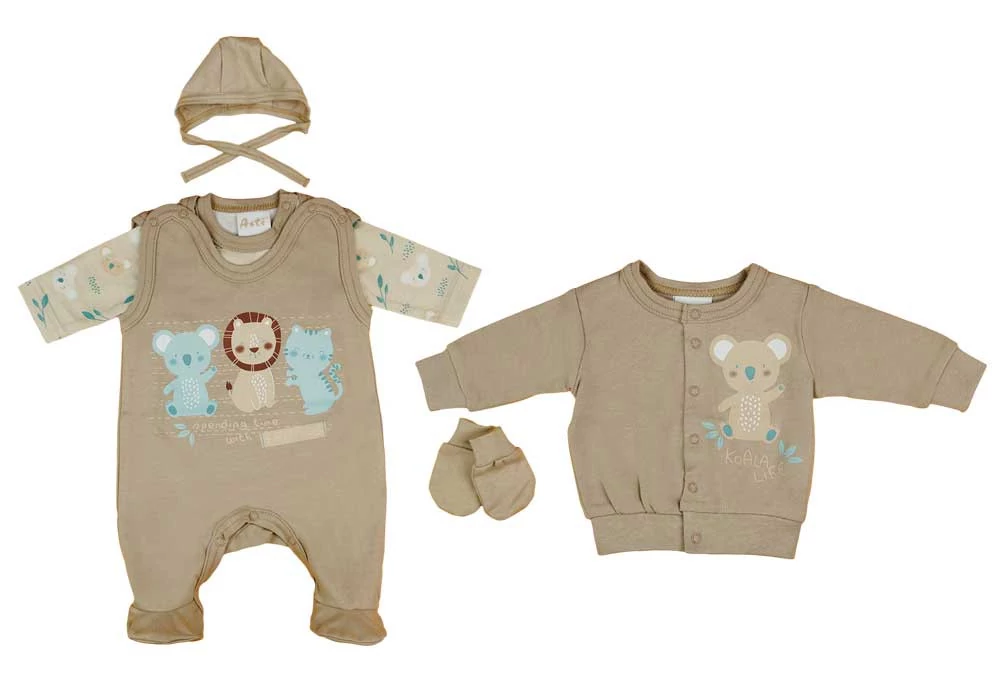 A szett tartalmaz egy ujjatlan rugdalózót, egy hosszú ujjú vállon patentos baba bodyt, egy elöl patentos kocsikabátot, egy puha baba sapkát és egy pár baba kesztyűt. Minden darabon a cuki koala karakter és más kedves állatkák jelennek meg, ami egyszerre játékos és divatos. A barna szín kellemes, nyugodt hangulatot áraszt. A szett minden darabja 100% pamutból készült, mely garantálja a puhaságot és a kényelmet a baba érzékeny bőre számára. A nikkelmentes patentok pedig biztosítják, hogy nem váltanak ki allergiás reakciót.