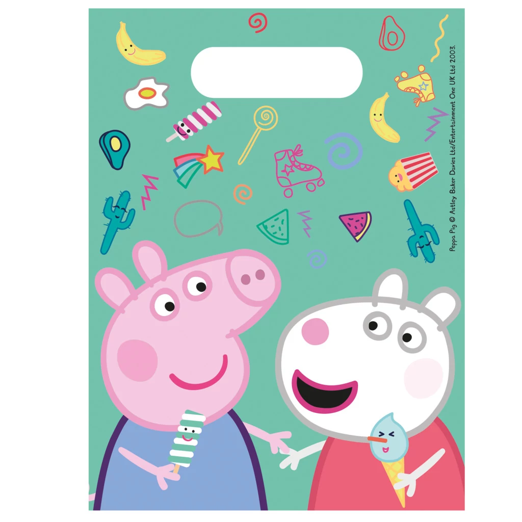 Peppa malacos ajándéktasak. Kiváló választás szülinapi zsúrokra, partikra Egy csomag 6 darab, kis méretű ajándéktasakot tartalmaz.
