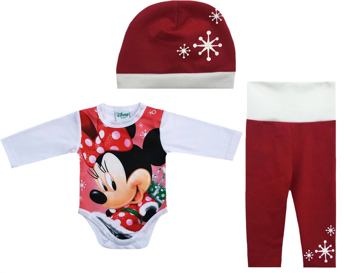 Baba 3 részes karácsonyi babaruha szett, Disney Minnie mintával. Kitűnő választás az ünnepi időszakra, illetve tökéletes ajándéknak is. A szett nagyon mutatós egyben, de részeit később a gyermekre külön is rá lehet adni, tehát rendkívül praktikus viselet.