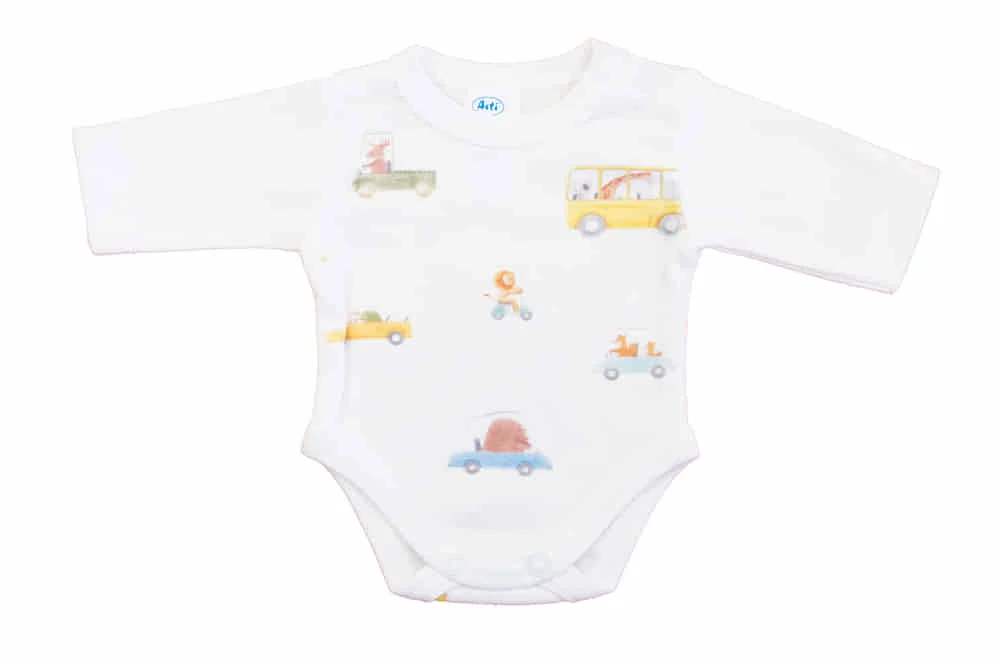 Baba body, hosszú ujjú, Autós mintával Kisbabák ruhatárának praktikus alapdarabja a body. Ez a cuki autós mintával telenyomott baba body minőségi, bababarát 100% pamut anyagból készült, szín- és formatartó anyagból, ami jól bírja a gyakori mosást is. Vállán patentos, így megkönnyíti a baba öltöztetését. A lába közötti patentos megoldás, pedig a gyors peluscserét teszi lehetővé. Minőségi magyar termék Anyaga: 100% pamut Minőség: I. osztály A termék nikkelmentes patenttal készül. A patent nem tartalmaz nikkelt, ezért nem vált ki allergiás reakciót az erre érzékeny babáknál.