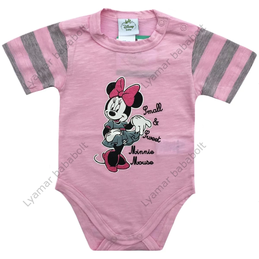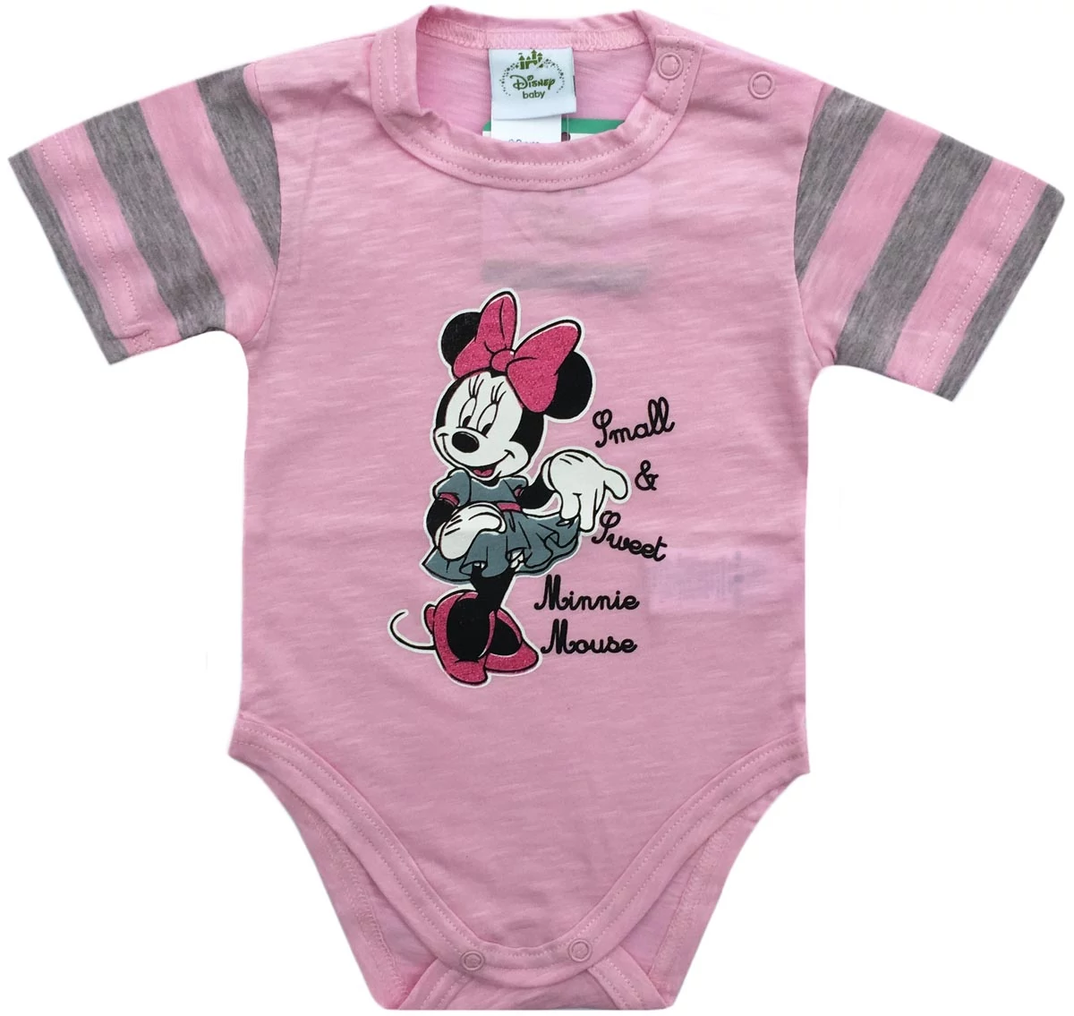 Disney, Minnie mesefigurás, rövid ujjú pamut body. A bodyn az egész alakos Minnie figurája látható "Small & Sweet Minnie Mouse" felirattal együtt, a minta részletesen kidolgozott. Finom anyagú, kellemes tapintású anyagból készült, mely kényelmes viseletet biztosít a baba számára.