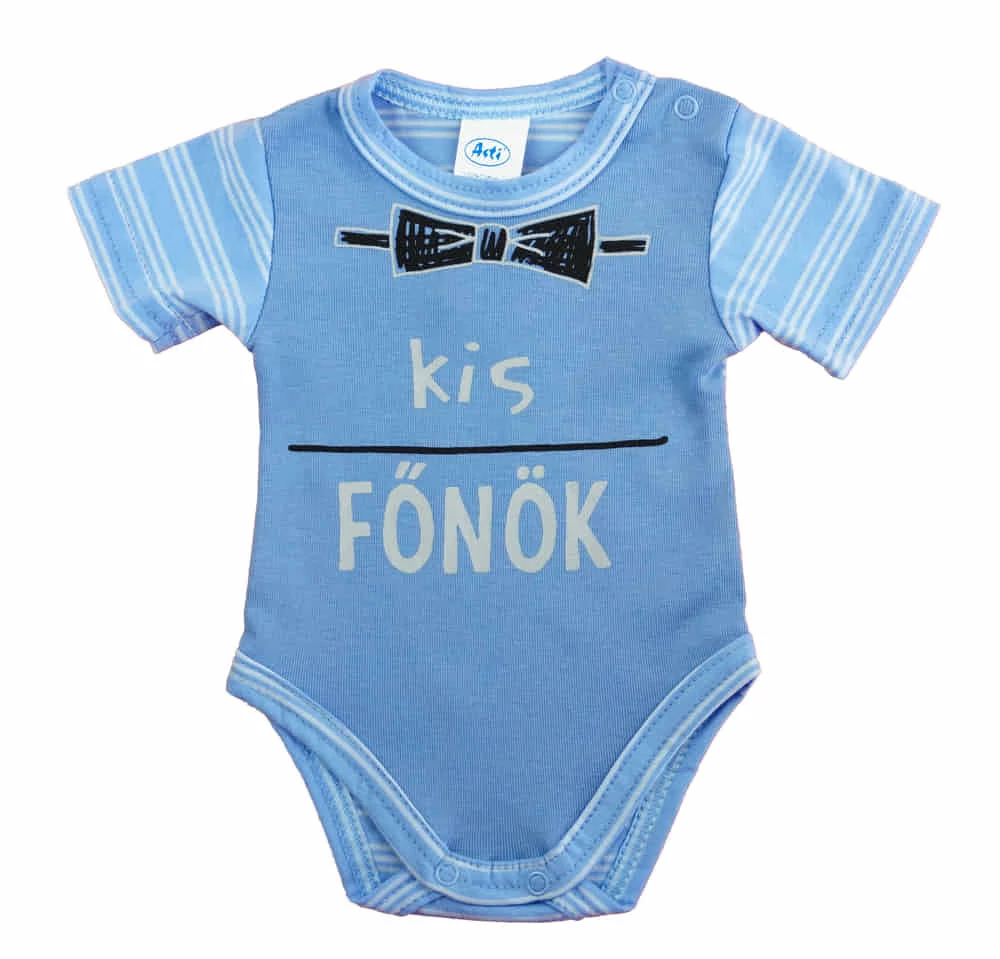 Feliratos rövid ujjú baba body Ezzel a vállon patentos, kék színű baba bodyval a kisbabád mindig stílusos lesz. A body feliratos, ami egyszerre vicces és aranyos. Az 100% pamut anyaga garantálja a kényelmet, és a nikkelmentes patentoknak köszönhetően nem kell aggódnod az allergiás reakciók miatt. Gondosan tervezett és készített termék, így biztos lehetsz benne, hogy a legjobbat kapod. A minőségi magyar termék, ami tökéletes választás minden unisex babáknak. Tökéletes választás, ha szeretnél egy igazán minőségi és kényelmes ruhadarabot a babádnak. Minőségi magyar termék Anyaga: 100% pamut, Minőség: I. osztály