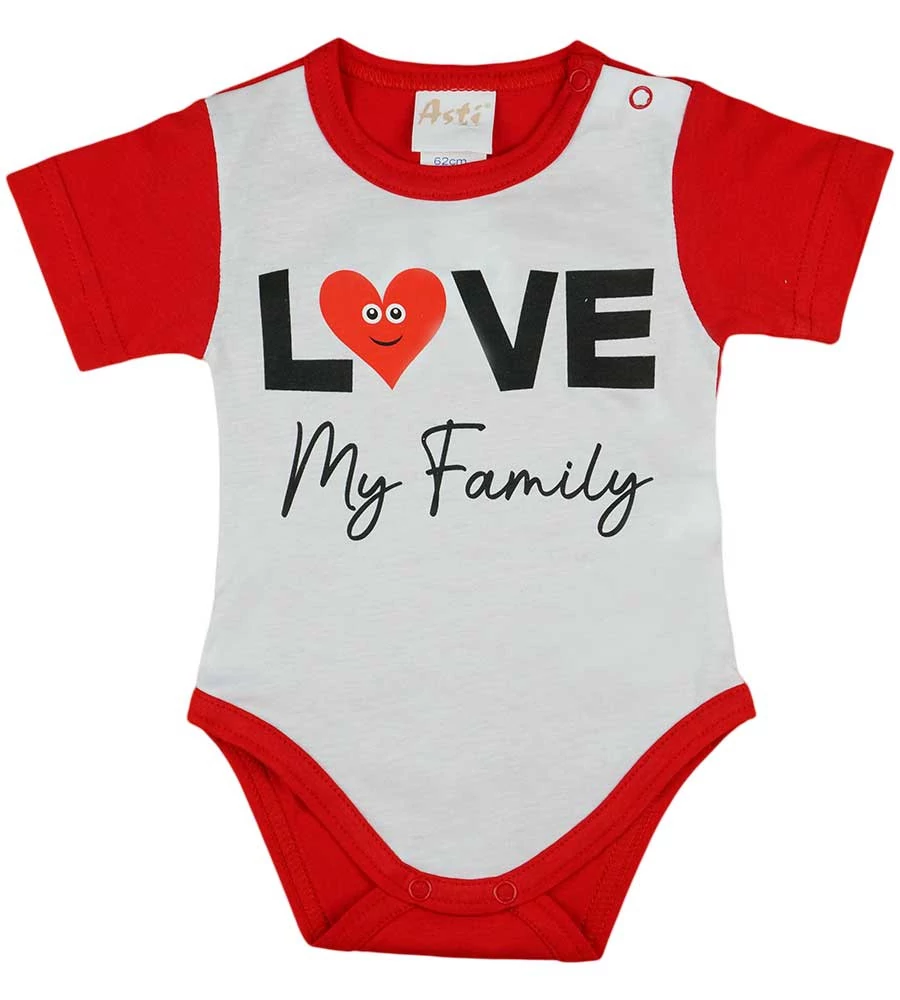 A "Love my family" feliratos rövid ujjú baba body igazi kincs a kis hercegnők számára. Az élénk piros színű, vállon patentos kialakítású kombidressz kényelmes viseletet biztosít a mindennapokban, miközben a rajta szereplő felirat szeretettel üzen a világnak. Minőségi magyar termék, mely a legpuhább 100% pamutból készült, garantálva ezzel a bőrbarát, allergiamentes viseletet. A nikkelmentes patentoknak köszönhetően pedig nem kell aggódnunk allergiás reakciók miatt. Tökéletes választás a minőségre és a kényelemre vágyó kismamák számára.