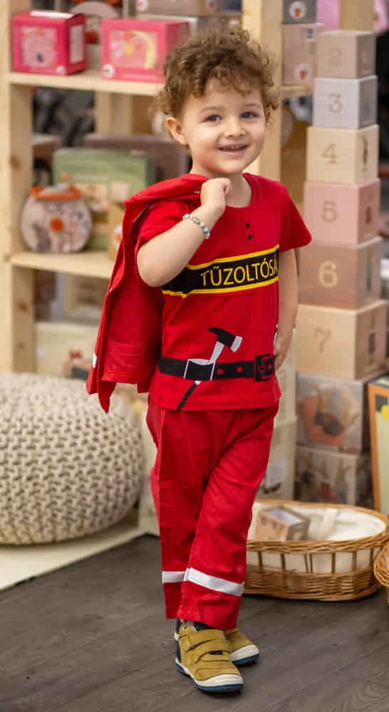 Egy igazi kis hősnek érezheti magát a csemetéd ebben a tűzoltós fiú rövid ujjú pólóban. A piros színű, rövid ujjú póló igazán élénk és vidám, mely garantáltan feldobja a fiad ruhatárát. A tűzoltós mintával nyomott design igazán egyedivé és játékoskodóvá teszi a pólót. Egy igazán minőségi magyar termék, mely 100% pamut anyagból készült, így biztosítja a kényelmet és a tartósságot. I. osztályú minőség, ami garantálja, hogy a póló hosszú ideig ellenáll az aktív, játékos napoknak.