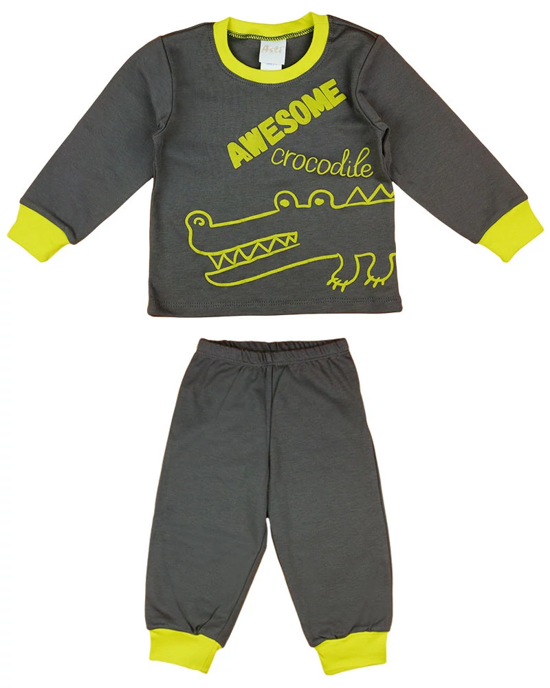 Egy kis kalandra vágysz az álomvilágban? Itt a tökéletes választás a kis felfedeződnek! A szürke alapszínű, krokodilos mintával dombornyomott pizsama garantáltan a gyermeked kedvence lesz. A pizsama felső és nadrág együttese kényelmes viseletet biztosít, így gondoskodik a nyugodt éjszakai pihenésről. A 100% pamut anyagból készült pizsama minőségi, első osztályú magyar termék, amely tartós és könnyen kezelhető. Készülj fel a szürke hétköznapok ellen egy kis vidám, krokodilos mókával!