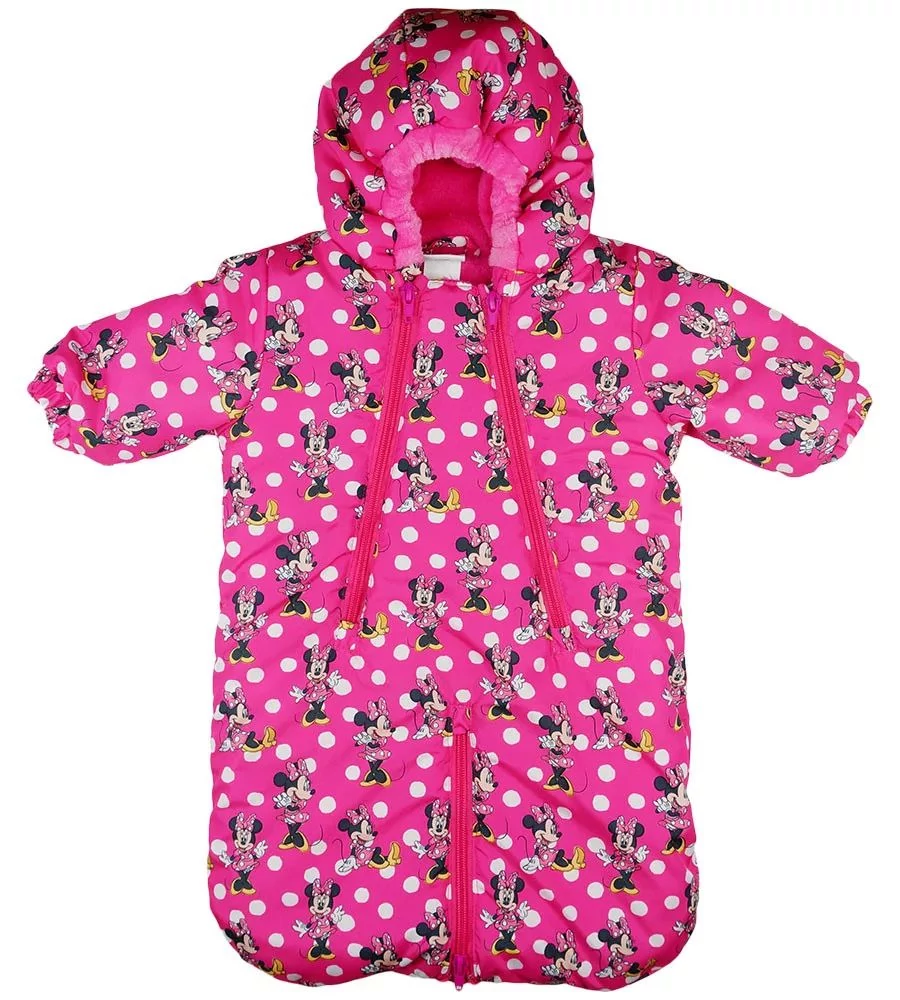 Vastagon bélelt, kapucnis, cipzáros, alul és felül is nyitható, vízlepergetős baba bundazsák, bébizsák Disney Minnie mitával. A bundazsák könnyen kabáttá alakítható, a lábai között található cipzáros rész segítségével pedig az autóban könnyen beköthető anélkül, hogy a babát le kellene vetkőztetni.
