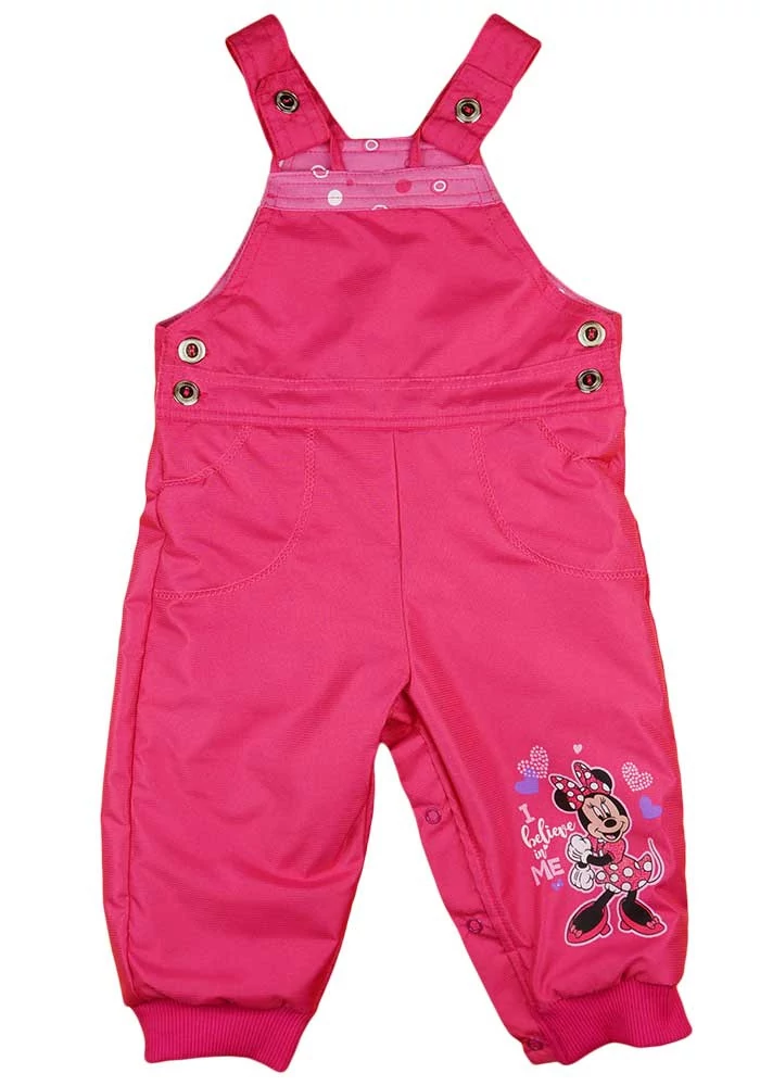 Állítható kantáros vízlepergetős, bélelt kertésznadrág Minnie egér mintával nyomva.