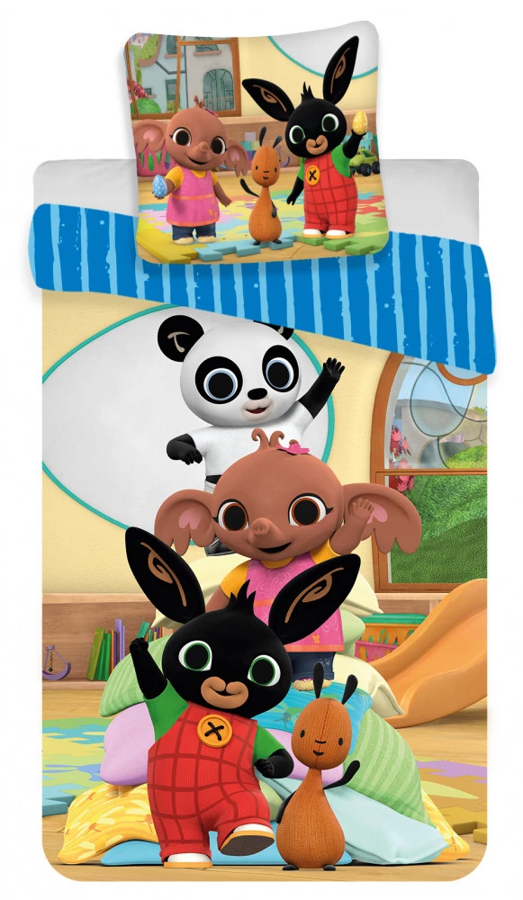 Az ágyneműhuzaton Bing, Szula, Pando, Coco, Amma, és legjobb barátja Flop integet vissza.
