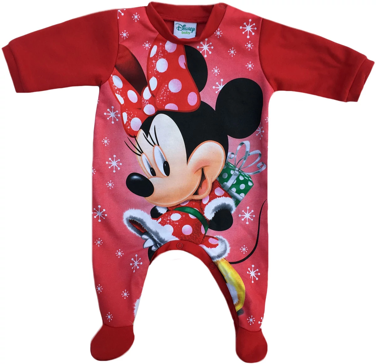 Gyönyörű karácsonyi mintás, bolyhosan bélelt, hosszú ujjú, vállpatentos, piros rugdalózó, Disney Minnie. A rugdalózón karácsony szépségével tárul elénk Minnie egérrel az érkező karácsony. Vastagsága miatt akár pizsamaoverálnak is használható. Nagyon könnyű átpelenkázni benne a babát. Rendkívül divatos, praktikus rugdalózó.