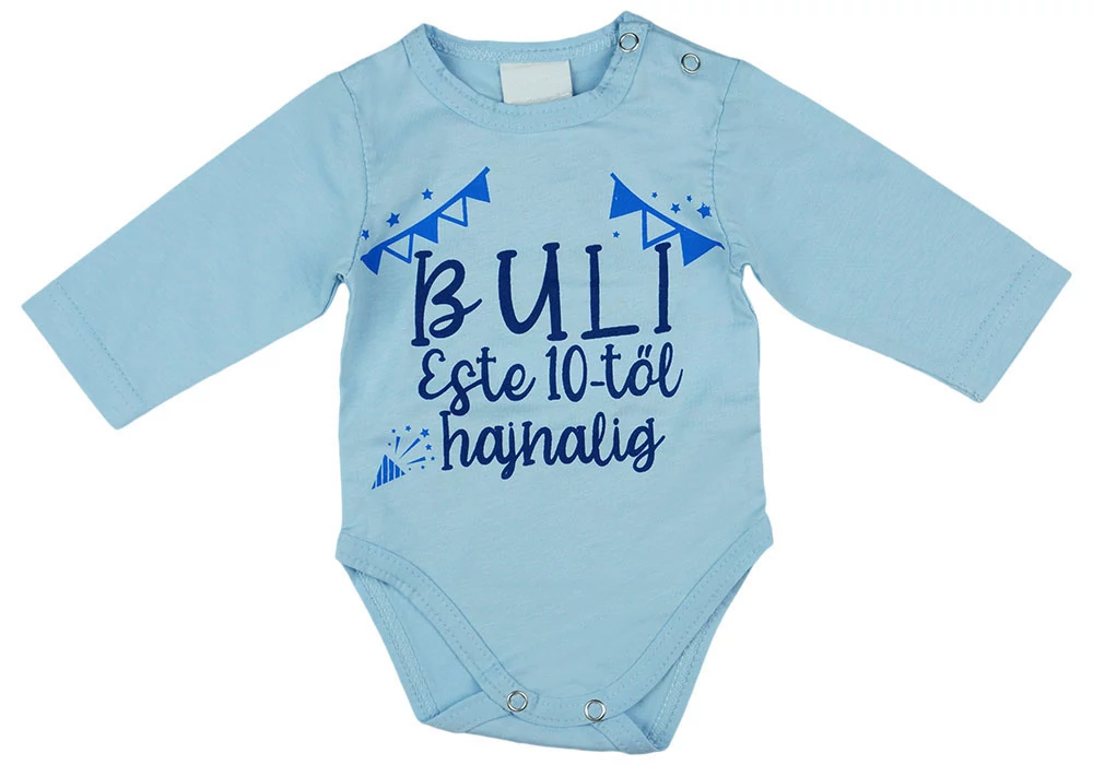 Buli este 10-től hajnalig hosszú ujjú feliratos baba body, vállon patentos kombidressz. A feliratos body nikkelmentes patenttal készül, így nem vált ki allergiás reakciót az arra érzékeny babáknál. Magyar termék.