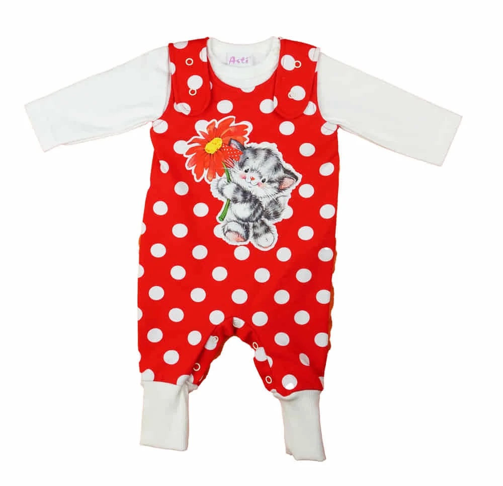 Egy kiváló minőségű, két részes szett, amely az ön kisbabáját szépségében és kényelmében egyaránt elkápráztatja. A szett magába foglal egy ujjatlan rugdalózót, amelyet cuki cicás mintával nyomtak és a vállánál állítható patenttal rendelkezik a tökéletes illeszkedés érdekében. A rugdalózó lábrészét fel lehet hajtani, hogy a kisbabának még több mozgásteret biztosítson. A szett tartalmazza még a hosszú ujjú, vállon patentos body-t is, amely kiválóan kombinálható más ruhadarabokkal is. Mindkét darab 100% pamutból készült, mely garantálja a puhaságot és a kényelmet. A 10% elasztán tartalom pedig a rugalmasságot és a tartósságot biztosítja. Minőségi magyar termék, amelyet nikkelmentes patenttal készítettek, így az érzékeny bőrű babák sem fognak allergiás reakciót tapasztalni. A piros szín pedig igazán vidámmá és élénkké teszi a szettet.