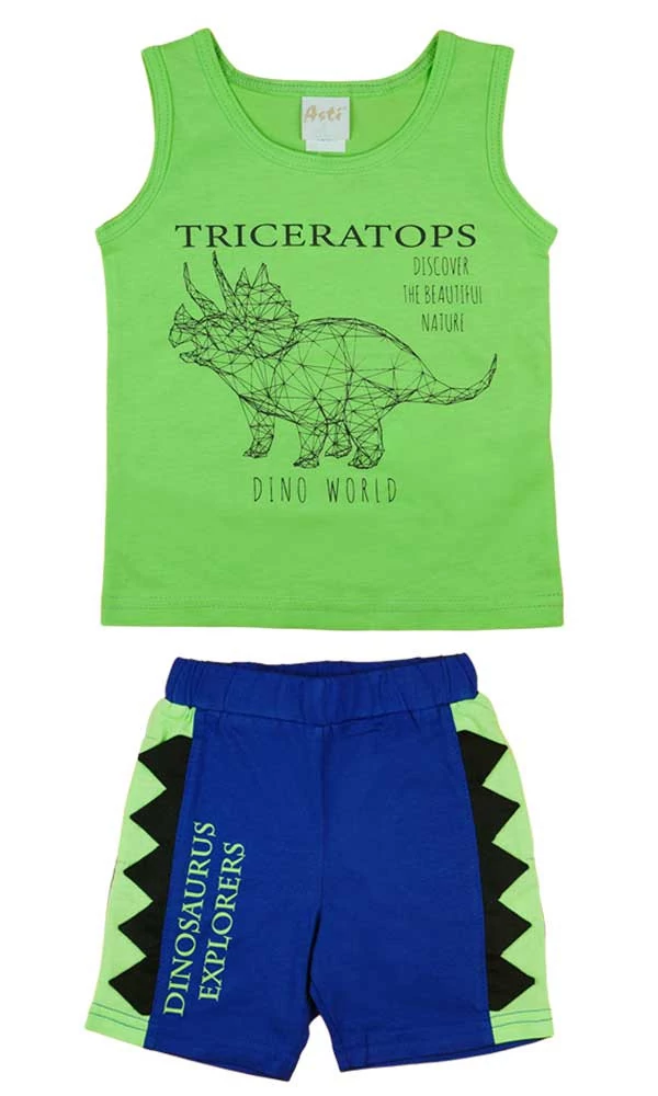 Vidám dinoszauruszos mintával ellátott kisfiú nyári szett, amelynek minden részlete a kényelemről és a stílusról szól. A szettben található egy vékony pamut anyagból készült atléta, mely tökéletes választás a nyári hőségben. A minta vidám és színes, ami garantáltan felvidítja a kicsik napját. Hozzá illik a gumis derekú rövidnadrág, amely oldalt tarajjal díszített és dinoszauruszos felirattal van ellátva. A szett 100% pamutból készült, ami lélegző anyag, ezért ideális a meleg napokra. A minőségi magyar termék az Andrea Kft-től származik, amely I. osztályú minőséget képvisel. A zöld szín pedig remekül kiegészíti a dinoszauruszos mintát. Varázsolja nyárrá a kisfiúk napjait ezzel a vidám, kényelmes szettel!