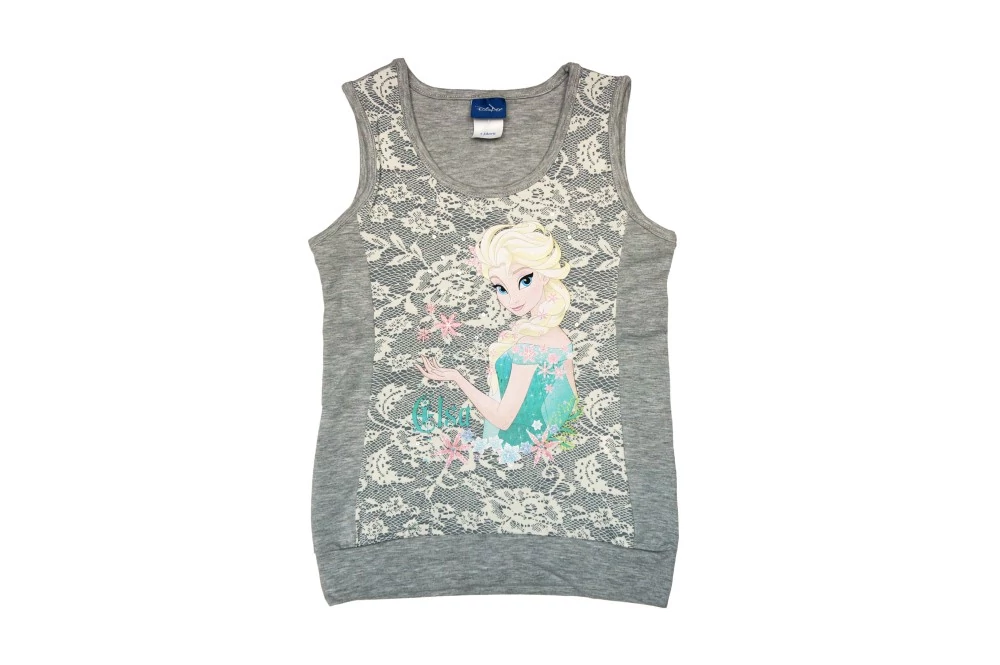 Eredeti Disney termék, amelyet a Jégvarázs - Frozen rajongói imádni fognak! Elsával nyomott mintával, a póló csillogó flitterekkel van díszítve, melyek igazán különlegessé teszik. Az elöl csipke hatású rész nőies, elegáns megjelenést biztosít, míg az alul passzés kialakítás tökéletes komfortérzetet nyújt. Az ujjatlan felső anyaga 90% pamut és 10% elasztán, így biztosítja a puhaságot és a rugalmasságot. Kiváló minőségű, I. osztályú magyar termék. A szürke szín pedig bármilyen színű ruházathoz illik. Tökéletes választás a nyári napokra!