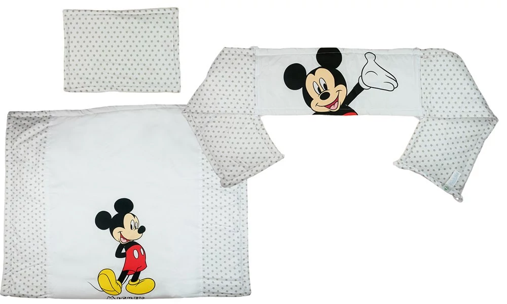 Gyönyörű, pamut Disney Mickey ágynemű szett, akár baba kiságyakba is. A szett tovább használható az ifjúsági ágyméretben is. Az ágynemű méretei megegyeznek az ovis szabványméretekkel is, így könnyedén felhúzható rá bármelyik szabványméretű ovis ágyneműhuzat is. A gyermekágy ékes dísze lehet, kitűnő választás, hiszen csecsemő kortól akár iskolás korig használható, ráadásul kiváló minőségű, magyar termék. A takarón és a rácsvédőn Mickey figurája látható, a varázslatos csillagos motívum pedig a szett összes részét díszíti. A minta részletesen kidolgozott, ahogy a képen is látható.