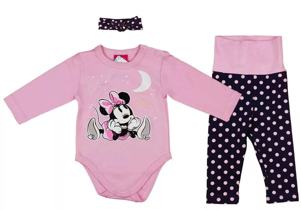 Disney Minnie 3 részes babaruha szett, mely tökéletes választás már újszülött kortól kezdődően. A szett 56 és 62-es méretekben tökéletesen használható hazahazós szettként is. A babaruha szett finom, pamut anyagból készült, szem előtt tartva a kisbabák igényeit, a szett magas minőségű magyar termék. A kislány babaruha szett nikkelmentes patenttal készült, így nem vált ki allergiás reakciót az arra érzékeny babáknál.