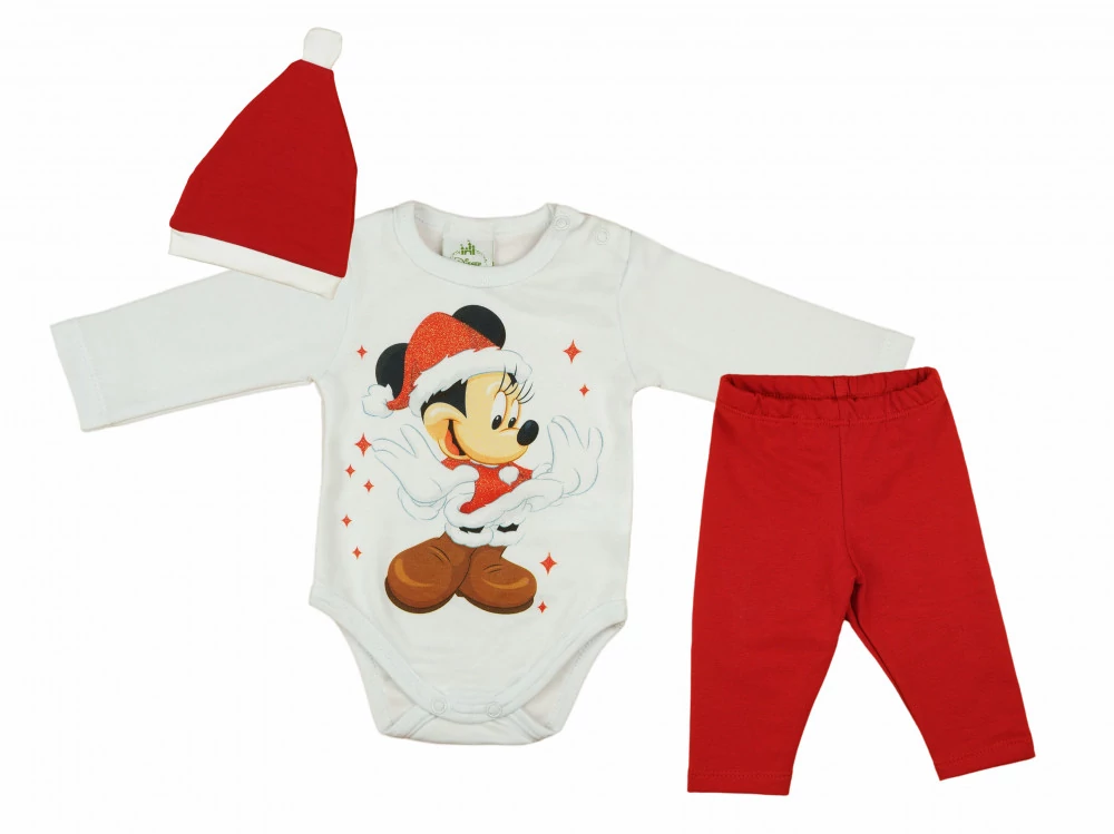 A Disney Minnie baba 3 részes szett igazi csemege a kicsik számára! Piros színű, eredeti Disney termék, melynek minden darabja a kényelem és a minőség jegyében készült. A szettben található egy glitteres Minnie mintával nyomott, hosszú ujjú kombidressz, mely 100% pamutból készült, így garantáltan kényelmes viselet lesz a babáknak. Ezen kívül a szett része egy belül bolyhos nadrág, mely 90% pamut és 10% elasztán anyagból készült, így tökéletesen illeszkedik a baba testéhez anélkül, hogy szorítana. A szettet továbbá egy belül bolyhos mikulás sapka is kiegészíti, mely szintén 90% pamut és 10% elasztán anyagból készült, és amely jól megtartja a hőt a hideg hónapokban. Az életkor csak irányadó!