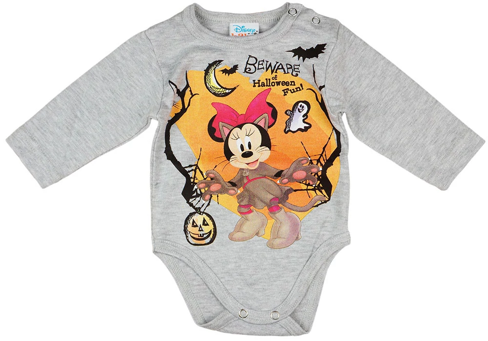 Tündéri Minnie egér mintás, hosszú ujjú baba body, mely a Halloween hangulatát varázsolja a kicsik öltözékébe. A szürke alapon jól érvényesülő, halloweeni mintával nyomott, Minnie egér figurás design különlegessé teszi ezt a kombidresszt. A vállon található nikkelmentes patentok segítségével könnyedén felvehető és levehető, így a pelenkázás is egy pillanat műve lesz. Kiváló minőségű, 100% pamut anyagból készült, így bőrbarát és kényelmes viselet a babának. Eredeti Disney termék, ami garantálja az elvárt minőséget és tartósságot. Magyarországon gyártott termék, melyet bátran ajánlunk minden kis Disney rajongónak. Minősége I. osztályú, ezért nem csak szép, de tartós is. A nikkelmentes patentoknak köszönhetően azon babák számára is biztonságos, akik érzékenyek a nikkelre, így nem vált ki allergiás reakciót. Tökéletes választás lehet Halloween alkalmából, vagy akár ajándéknak is.