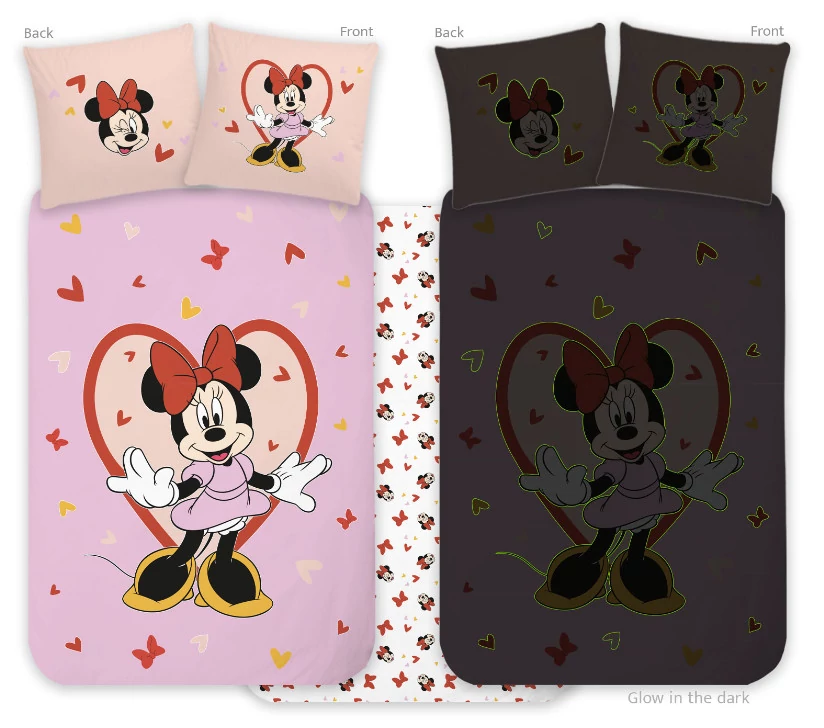 - Különlegesség: Sötétben világít! A minta fő elemei (Minnie, szívek, pillangók) nappal feltöltődnek fénnyel, majd az éjszaka sötétjében varázslatosan foszforeszkálnak.