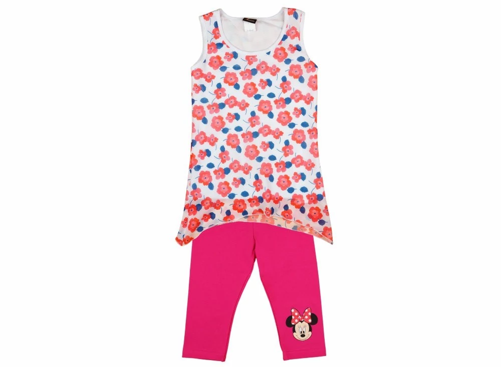 A Disney Minnie lányka 2 részes ujjatlan-3/4 leggings szett cuki és kényelmes választás a kis hercegnők számára. A szett egy muszlin anyagú, virágos mintázatú ujjatlan felsőből és egy 3/4-es hosszúságú Minnie mintás leggingsből áll. A felső belső része 100% pamut, míg a külső rész 100% poliészter, biztosítva ezzel a tökéletes kényelmet és tartósságot. A leggings anyaga szintén 100% pamut, és egy csillogó Minnie mintával van díszítve a szárán. Mindkét darab I. osztályú minőségű, eredeti Disney termék. Kérjük, vegye figyelembe, hogy a terméknél megadott életkor csak irányadó! A szett ideális ajándék lehet minden kis Minnie rajongó számára.