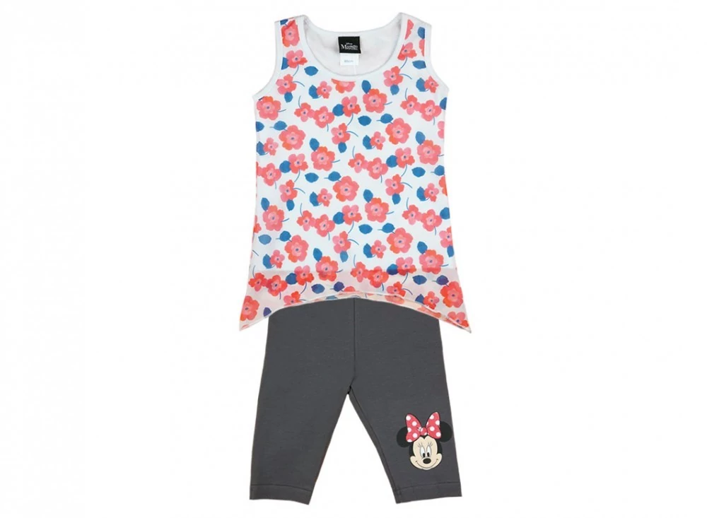 Csodálatos Disney Minnie lányka szett, amely minden kislány álma! Egy igazán színes, virágos és vidám, muszlin anyagból készült ujjatlan felsőből és egy 3/4-es leggingsből áll, melyen a szárán glitteres Minnie minta díszeleg. A felső belső része 100% pamut, míg a külső része 100% poliészter, így nemcsak gyönyörű, de kényelmes is. A leggings anyaga szintén 100% pamut, amely garantálja a kényelmet és a tartósságot. Mindkét darab I. osztályú minőségű, eredeti Disney termék. Az ajánlott életkor 5-7 év, de természetesen minden terméknél az életkor csak irányadó. Bűvölje el kislányát ezzel a csodálatos Minnie egeres szettel!