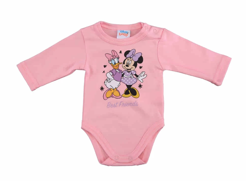 A Disney Minnie mintával nyomott hosszú ujjú baba body a kisbabák ruhatárának praktikus, nélkülözhetetlen kelléke. A rózsaszín darabot egy aranyos Minnie minta díszíti, ami garantáltan elvarázsol minden kis Disney rajongót. A 100% pamutból készült body nem csak kényelmes és puha viseletet biztosít, de szín- és formatartó anyagának köszönhetően a gyakori mosást is jól bírja. A vállán található patentos megoldás megkönnyíti a baba öltöztetését, míg a lába közötti patent a gyors peluscserét teszi lehetővé. Az eredeti Disney termék minőségi magyar termék, az I. osztályú kivitel pedig hosszú távú használatot garantál. A termékben található patent nikkelmentes, így az arra érzékeny babák számára is biztonságos választás. Csempéssze a Disney varázslatát babája mindennapjaiba ezzel a különleges bodyval!