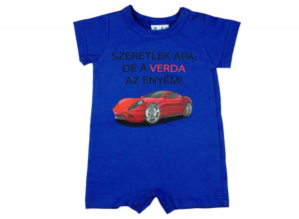 A "Szeretlek apa, de a Verda az enyém!" feliratos napozó a kisfiúk kedvence lesz! A könnyed, rövid ujjú fazonnak köszönhetően még a legforróbb nyári napokon sem okoz majd gondot a viselete. A kék színű napozó a vállon és a lábszáron található patentokkal könnyedén felvehető és leválasztható, így a pelenkázás is gyerekjáték lesz. Az 100% pamut anyagának köszönhetően kényelmes viseletet biztosít, miközben bőrbarát, mivel nem okoz irritációt még az érzékeny bőrű babáknál sem. Az első osztályú minőségű, magyar gyártású termék nikkelmentes patentokkal készült, így a használat során nem vált ki allergiás reakciót.