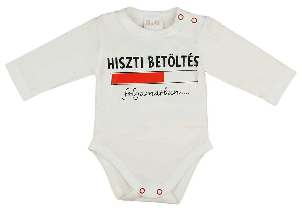 Feliratos, vállon patentos hosszú ujjú baba body.
