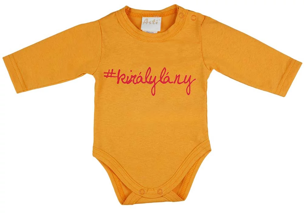 Egy igazán különleges darab ez a feliratos hosszú ujjú baba body, melyet kis lányodnak terveztünk! A vidám narancs szín azonnal feldobja a napot, a vállán lévő patent pedig egyszerűvé és gyorsá teszi az öltöztetést. A body minőségi magyar termék, melyet az Andrea Kft. készített, így biztos lehetsz benne, hogy kisbabád a legjobbat kapja. A 100% pamut anyag pedig garantálja, hogy puha és kényelmes viselet lesz a bőrének. De ami a legfontosabb: a termék nikkelmentes patenttal készült, így nem kell attól tartanod, hogy allergiás reakciót váltana ki a babánál. Legyen szó pihenésről, játékról vagy éppen az első nagy kalandokról, ez a body tökéletes választás minden alkalomra!