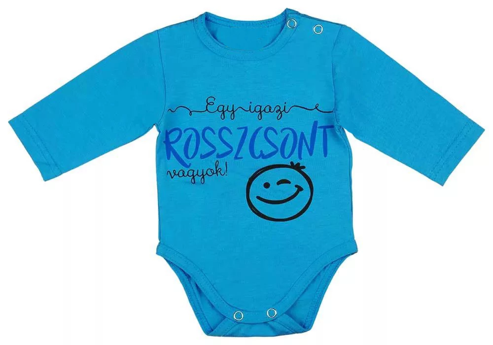 Egy igazi rosszcsont vagyok, hosszú ujjú feliratos baba body, vállon patentos kombidressz. A feliratos rövid ujjú kombidressz, könnyen kezelhető 100% baba barát pamutból készült, praktikus és kényelmes alapdarabja a kisbaba ruhatárának. A feliratos body nikkelmentes patenttal készül, így nem vált ki allergiás reakciót az arra érzékeny babáknál. Magyar termék.