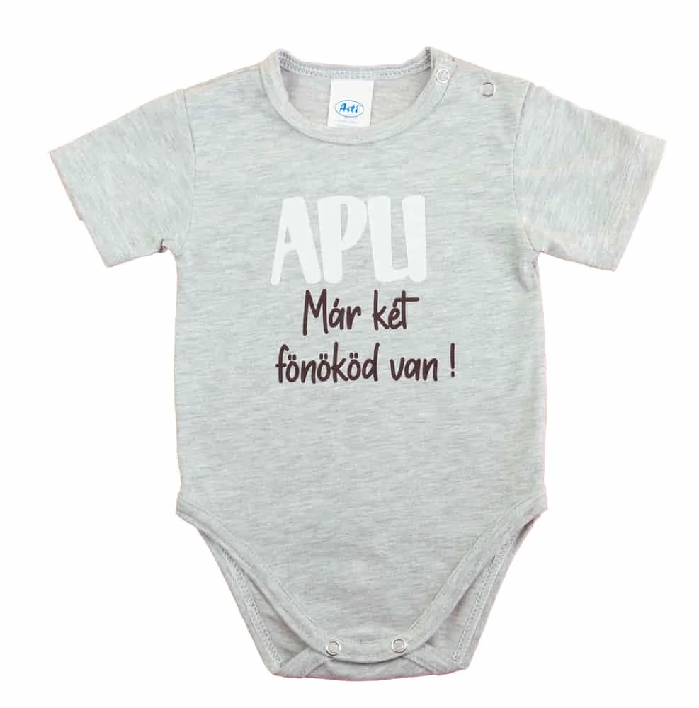 Feliratos rövid ujjú baba body Ezzel a vállon patentos, szürke színű baba bodyval a kisbabád mindig stílusos lesz. A body feliratos, ami egyszerre vicces és aranyos. Az 100% pamut anyaga garantálja a kényelmet, és a nikkelmentes patentoknak köszönhetően nem kell aggódnod az allergiás reakciók miatt. Gondosan tervezett és készített termék, így biztos lehetsz benne, hogy a legjobbat kapod. A minőségi magyar termék, ami tökéletes választás minden unisex babáknak. Tökéletes választás, ha szeretnél egy igazán minőségi és kényelmes ruhadarabot a babádnak. Minőségi magyar termék Anyaga: 100% pamut, Minőség: I. osztály