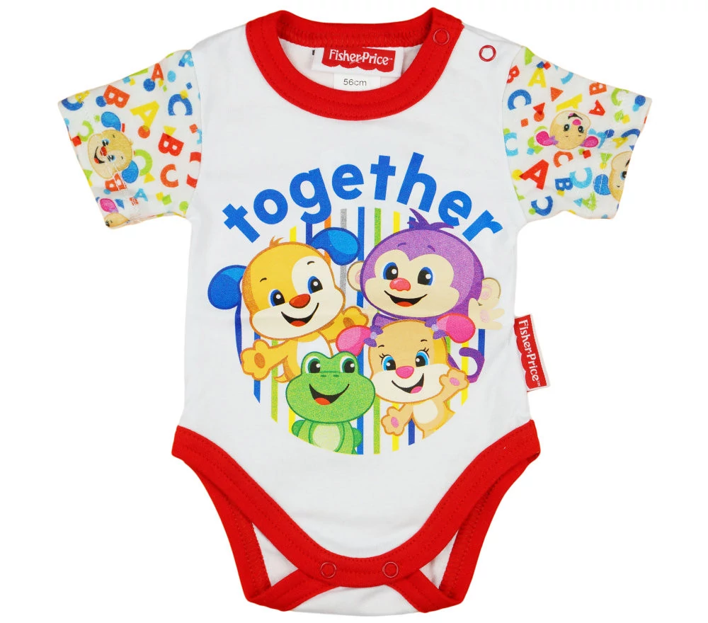 Öltöztesd be a babád ebben a Fisher-Price rövid ujjú baba bodyban! Unisex kialakítása miatt tökéletes választás kisfiúk és kislányok számára egyaránt. Fehér színe könnyedén kombinálható bármilyen más ruhadarabbal, így a babának mindig stílusos lesz a megjelenése. A vállon elhelyezkedő patentok segítségével könnyű lesz fel- és levenni a bodyt, ami nagyban megkönnyíti a pelenkázást és öltöztetést. Vidám Fisher-Price minta díszíti az ujját, ami még cukibbá teszi ezt a kis ruhadarabot. A body Magyarországon készült, így biztos lehetsz benne, hogy minőségi, eredeti Mattel termékről van szó. Anyaga 100% pamut, ami garantálja, hogy a baba bőre lélegezni tud és nem okoz irritációt. A minősége pedig első osztályú, hiszen a Fisher-Price mindig is a legmagasabb színvonalat képviselte a babaruha piacon.