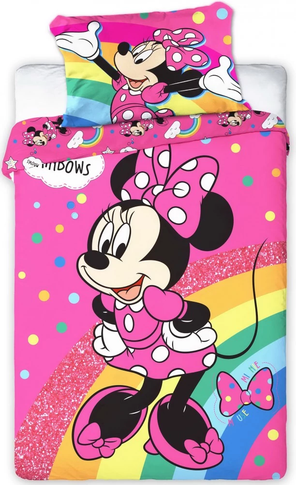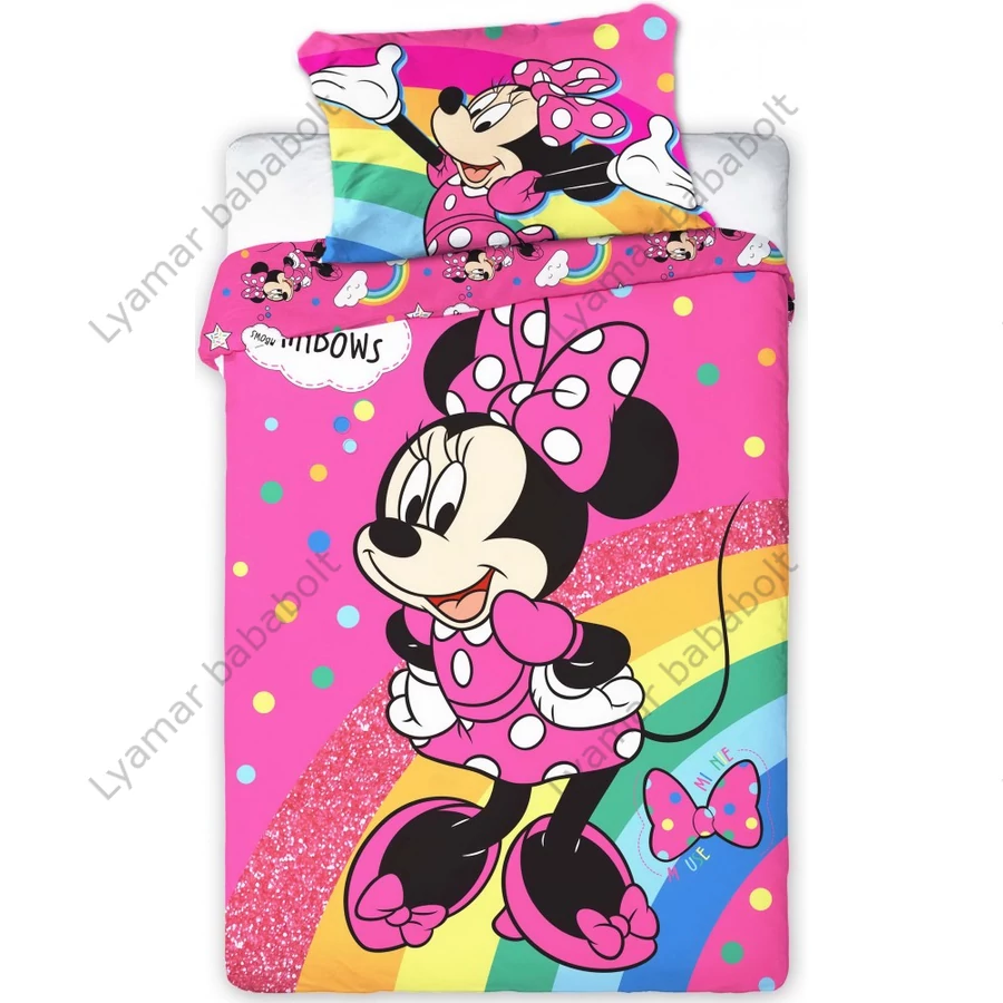 Csodaszép pamut Disney Minnie ágyneműhuzat, mely a normál óvodai méreteknek is megfelel, így nem csak otthon lehet a gyermekágy ékes dísze. A takarón Minnie látható. A minta részletesen kidolgozott, ahogy a képen is látható. Minnie mintája mind a párnahuzaton, mind pedig a takarón megtalálható.