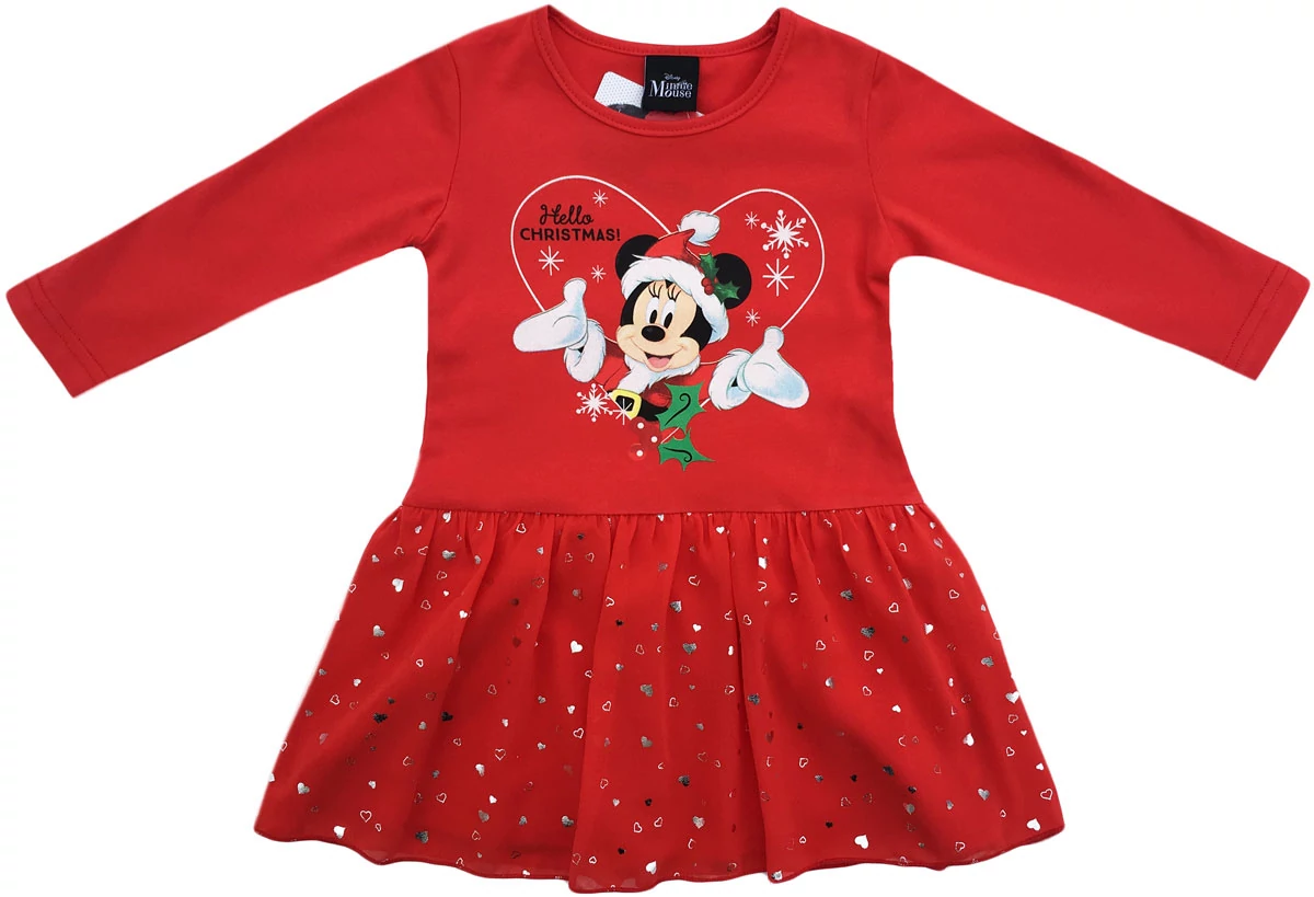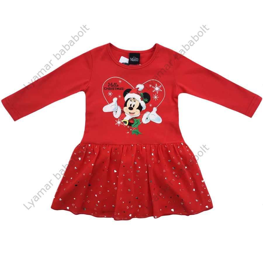 Disney Minnie Mouse mintás, hosszú ujjú, tüllszoknyás karácsonyi ruha, gyönyörű Minnie mintával. A szoknyát Minnie egér szívecskében teljesen egyedivé varázsolja, gyönyörű karácsonyi motívumokkal díszítve, melyet tovább fokoz a szoknya tüllrészén látható gyönyörű szívecskés díszítés.. Kitűnő ajándékötlet és egyben alkalmi viselet is lehet. Kíméletes mosás és vasalás kifordított állapotban javasolt.